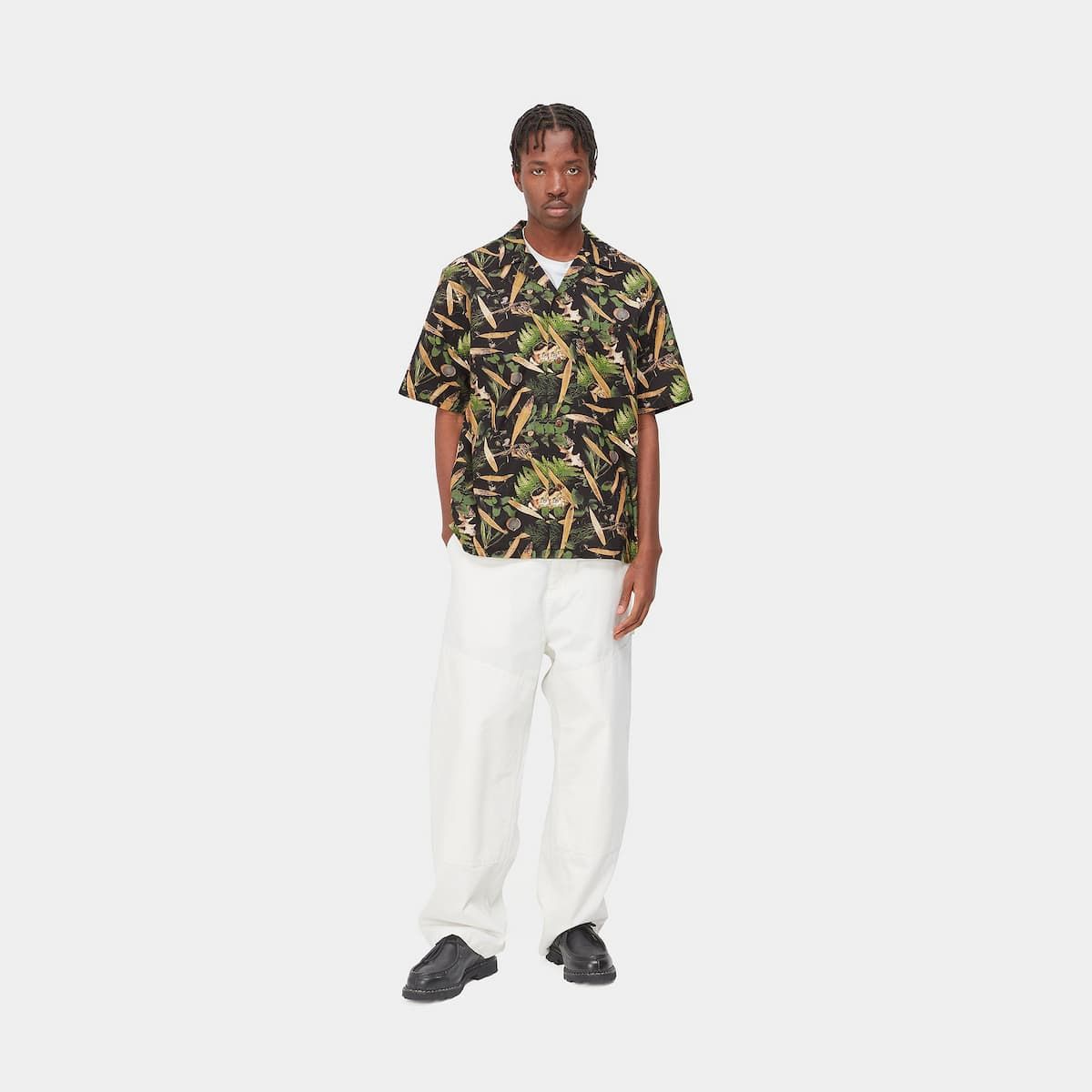 Esta camisa surfera cuenta con ajuste holgado, manga corta, cierre de botones de coco, cuello con solapas, lavado en prenda, estampado integral de temporada inspirado en impresiones lumínicas, un bolsillo en el pecho y una etiqueta tipo bandera de Carhartt tejida en la costura lateral.