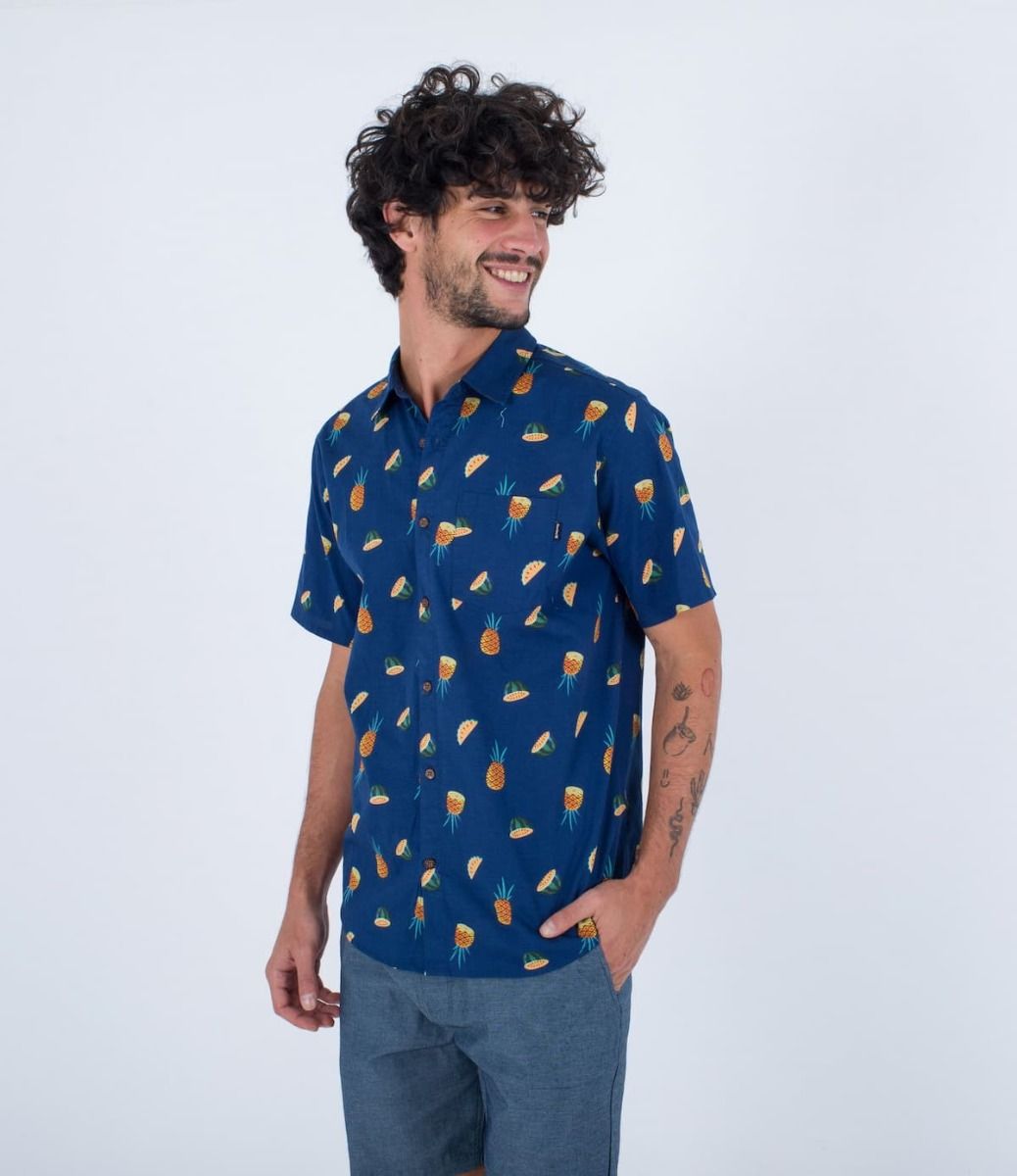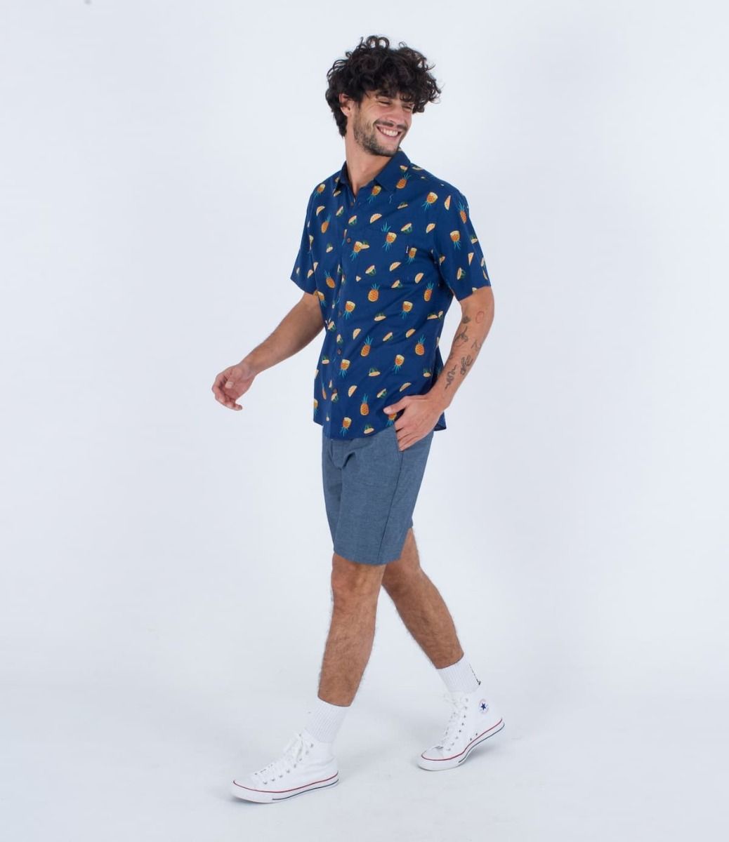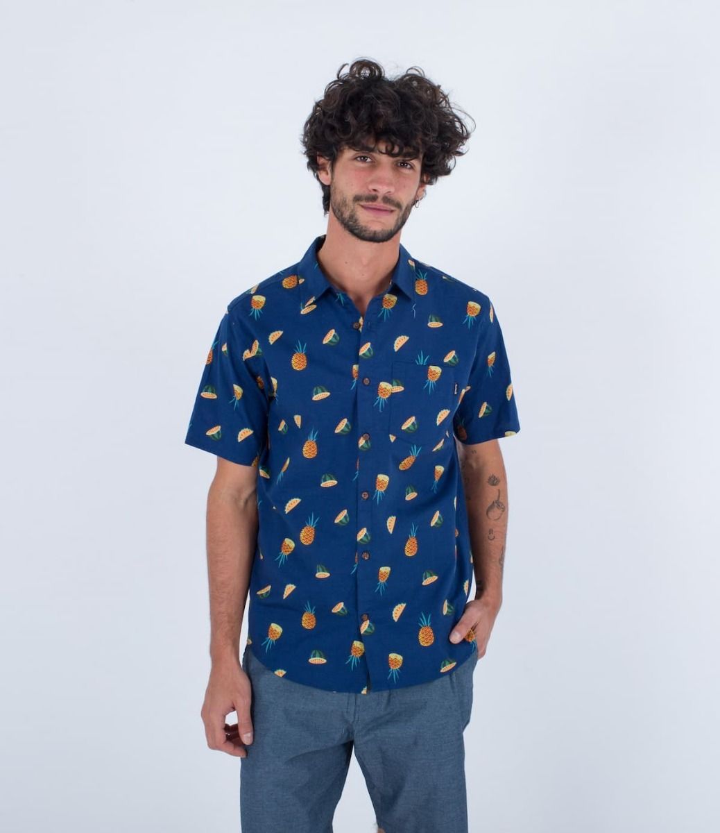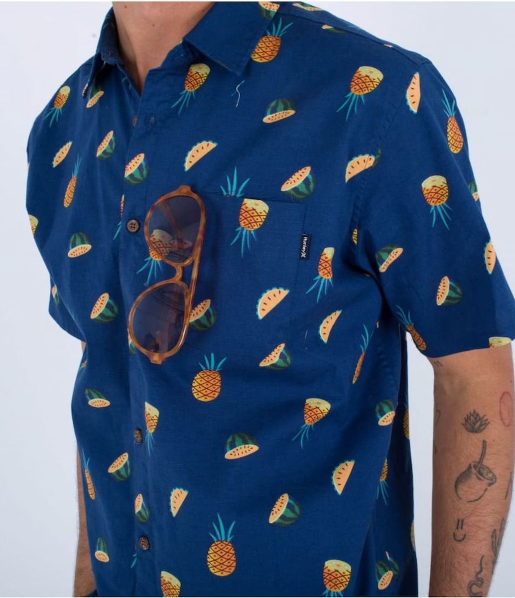 Esta camisa de estilo hawaiano cuenta con manga corta, cuello clásico, bolsillo de parche en el pecho con ranura para gafas de sol, cierre de botones, estampado en toda la prenda de piñas y sandías, dobladillo festoneado, pliegues en el canesú trasero y una etiqueta de Hurley One & Only tejida en el bolsillo.