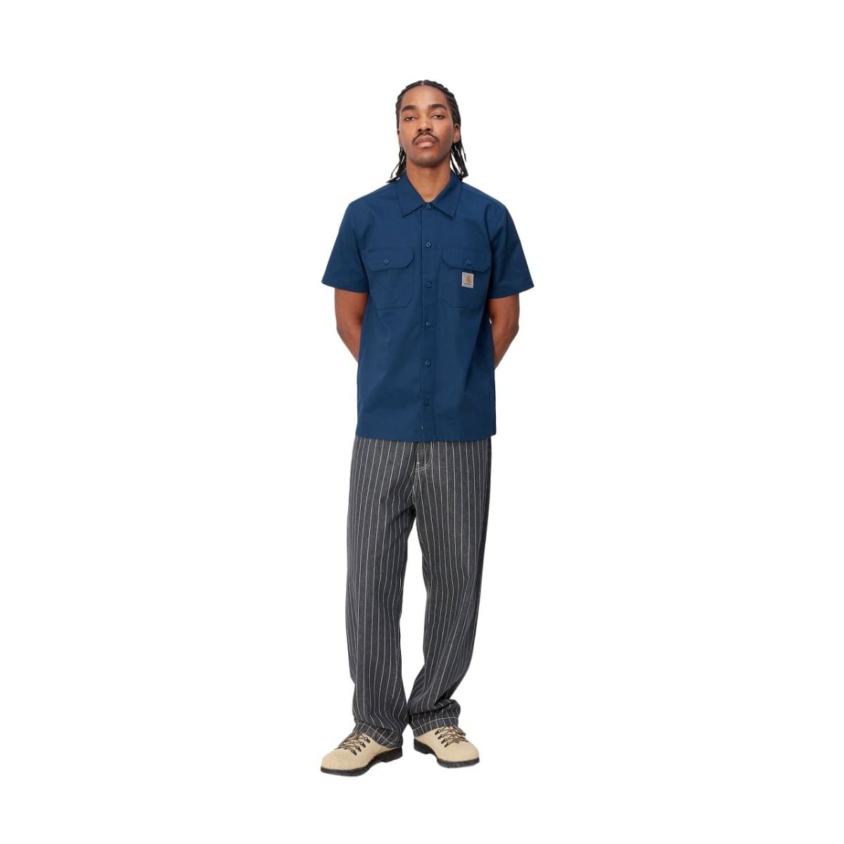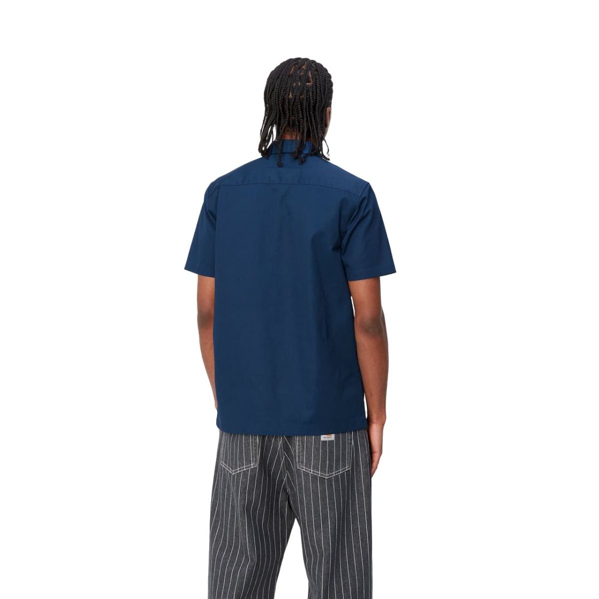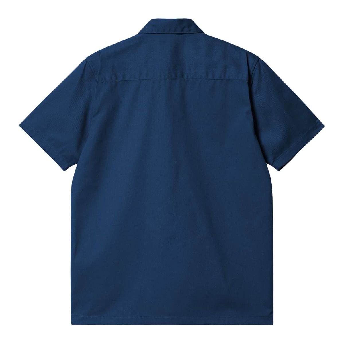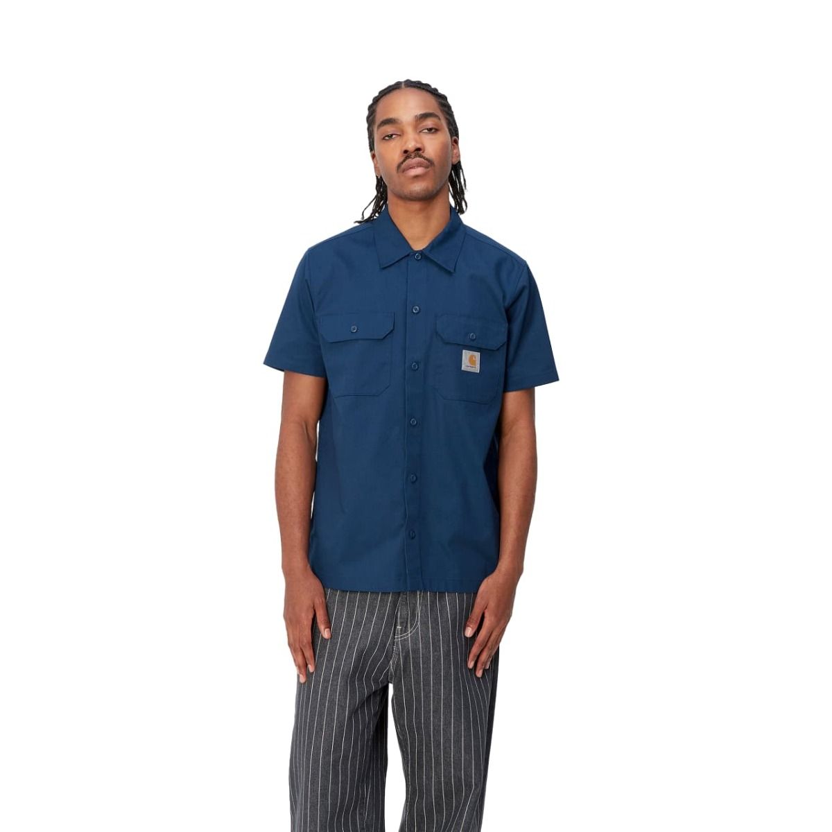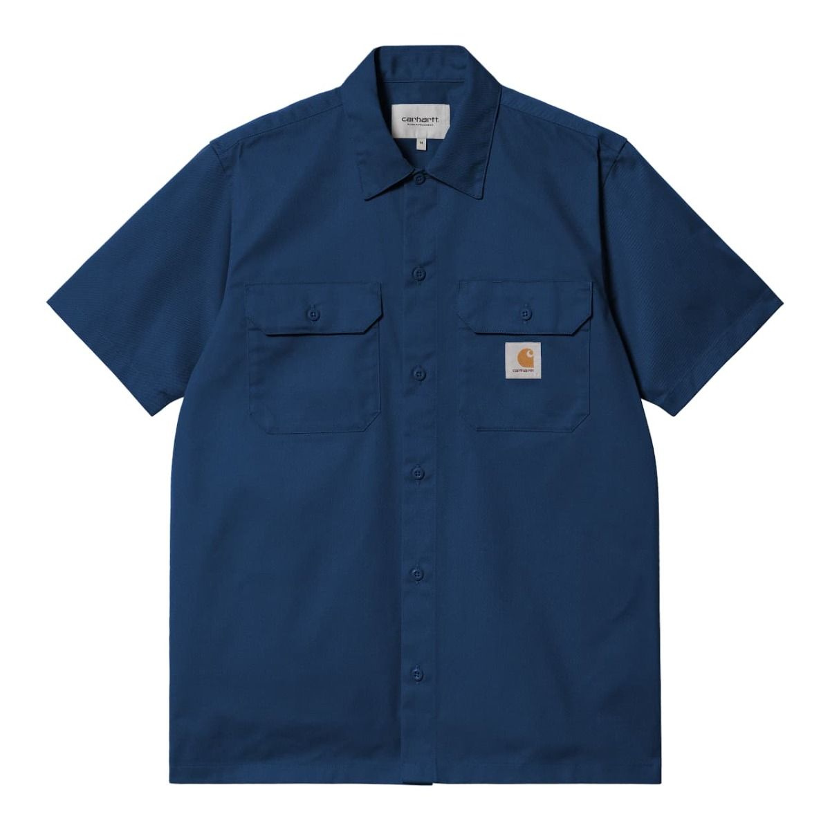 Esta camisa Carhartt azul presenta ajuste regular, manga corta, dos bolsillos en el pecho con solapa y botón para que lleves contigo tus pequeños objetos esenciales, cierre de botones azules para un look completamente monocolor, dobladillo recto y una etiqueta cuadrada de Carhartt tejida en el bolsillo izquierdo.