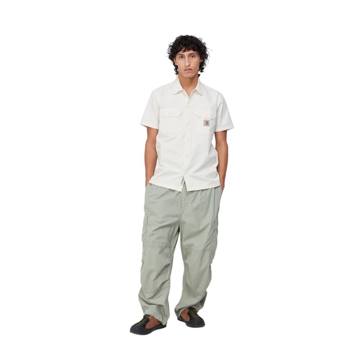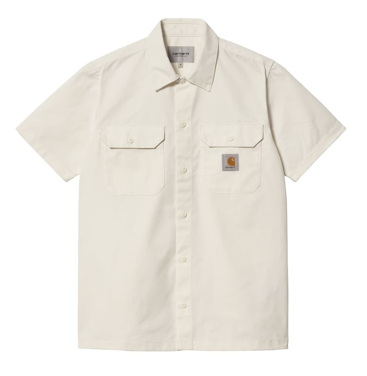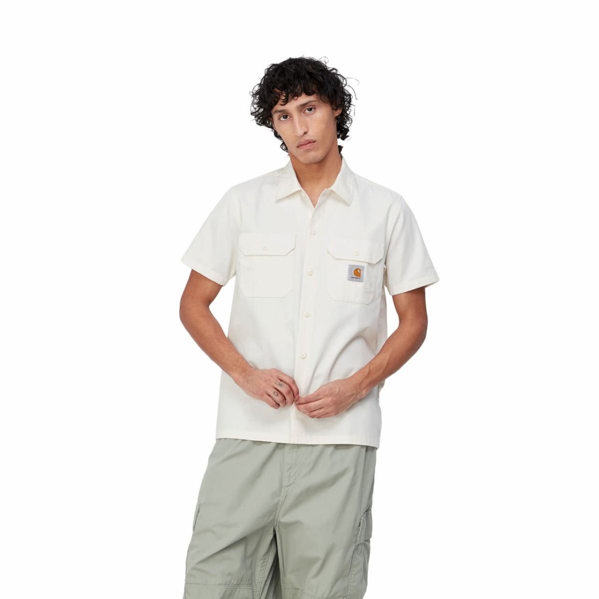 Esta camisa Carhartt blanca presenta ajuste regular, manga corta, dos bolsillos en el pecho con solapa y botón para que lleves contigo tus pequeños objetos esenciales, cierre de botones azules para un look completamente monocolor, dobladillo recto y una etiqueta cuadrada de Carhartt tejida en el bolsillo izquierdo.