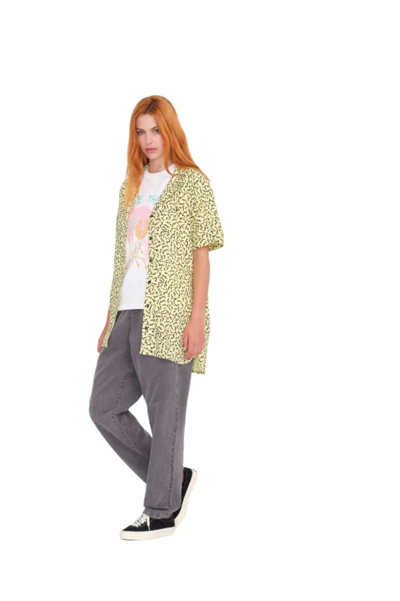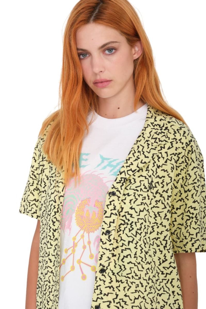 La camisa de manga corta para mujer Surfpunk Woven SS en amarillo (Aura Yellow) con estampado de la Colección Asphalt Beach de Volcom está confeccionada con 100% viscosa.