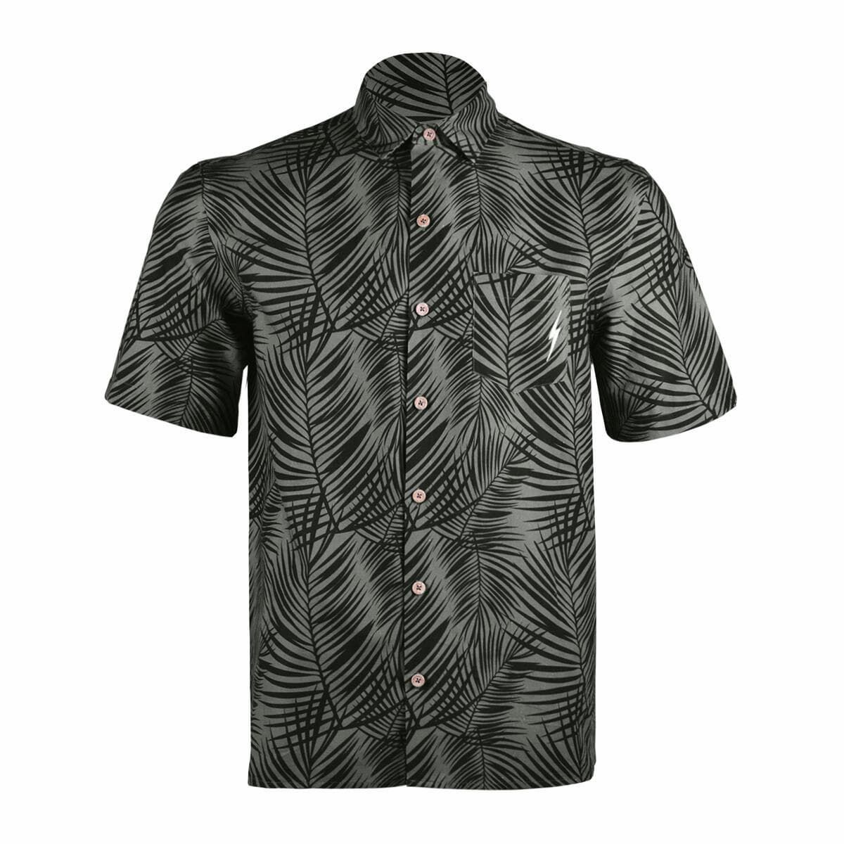 La camisa de manga corta Tropical Earth gris para hombre tiene una etiqueta de garantía Lightning Bolt en el cuello interior.