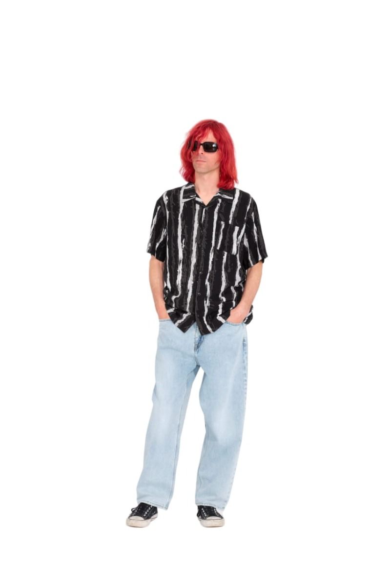 Esta camisa veraniega de corte clásico, perteneciente a la Colección Volcom Ent X Hockey Dad, cuenta con manga corta, cuello abierto, un bolsillo de parche en el pecho, cierre de botones con logo Volcom, estampado con diseño de Hockey Dad y una pequeña etiqueta de la marca tejida.