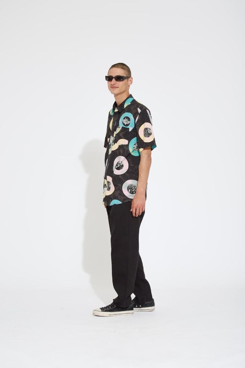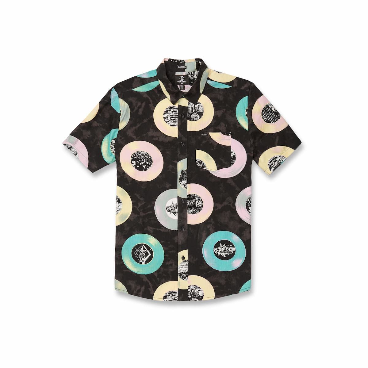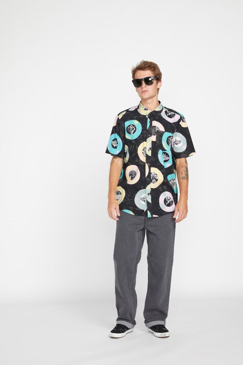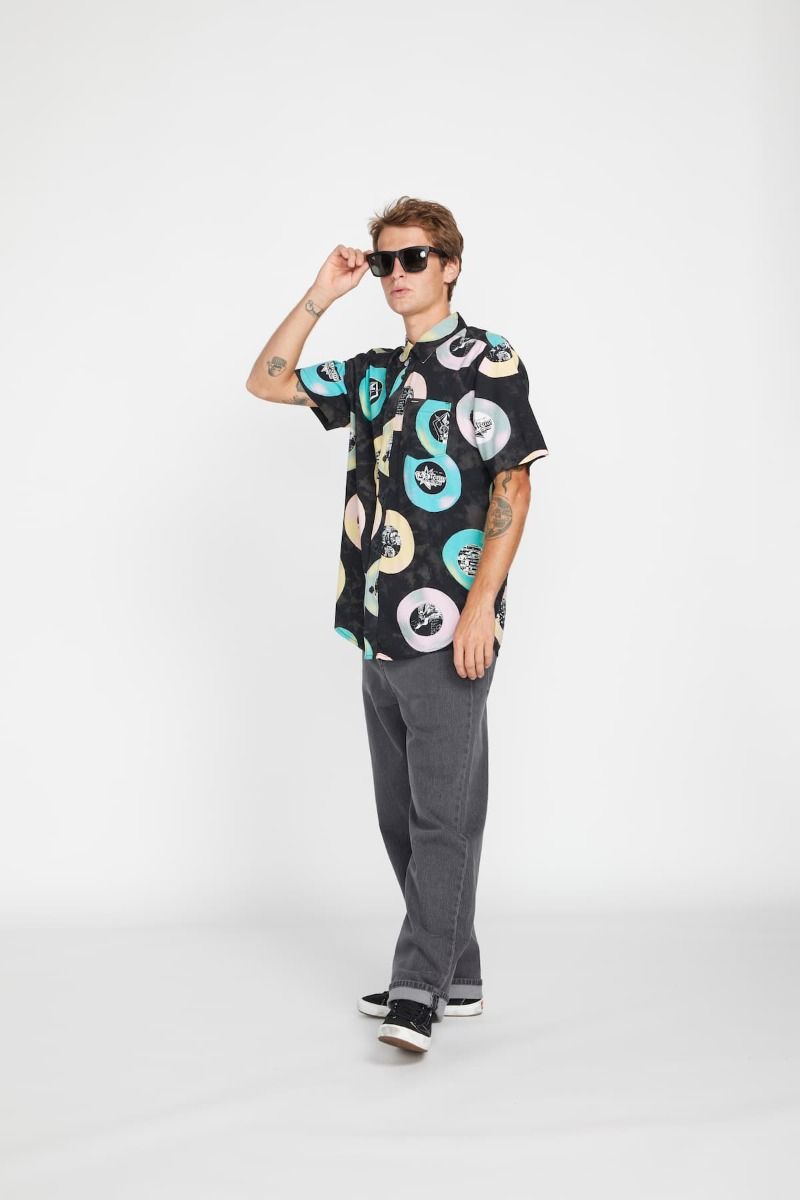 Esta camisa de corte clásico cuenta con manga corta, un bolsillo de parche en el pecho, cierre de botones con logo Volcom, estampado Volcom Entertainment junto con gráficos de LP's, una discreta etiqueta de la marca tejida en el bolsillo y el logo Stone bordado.
