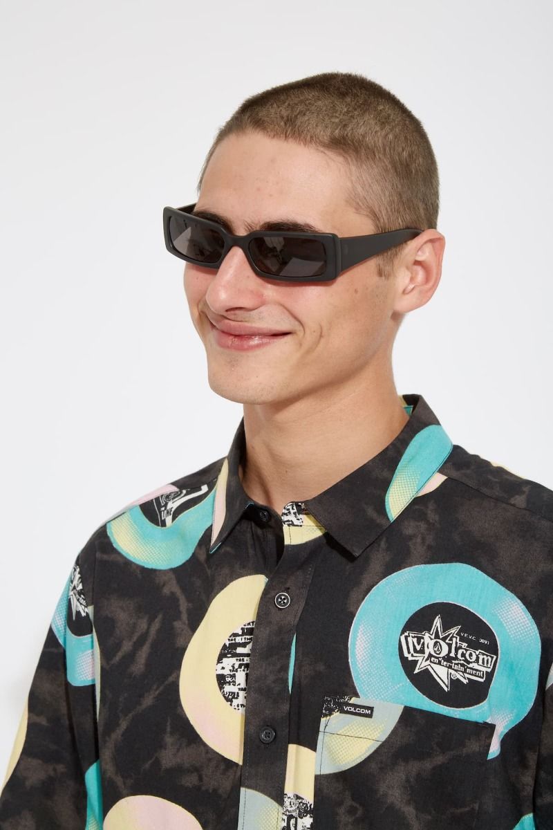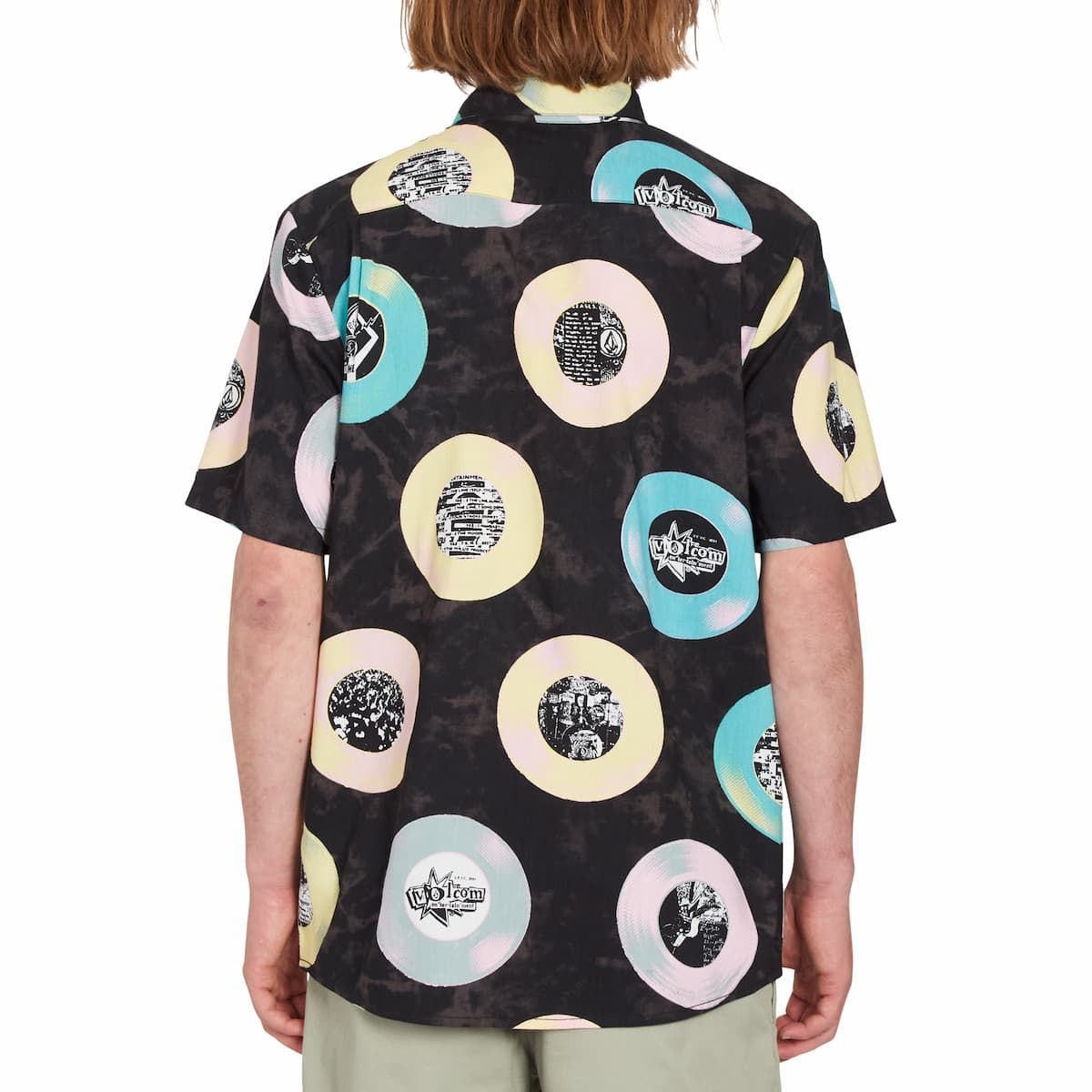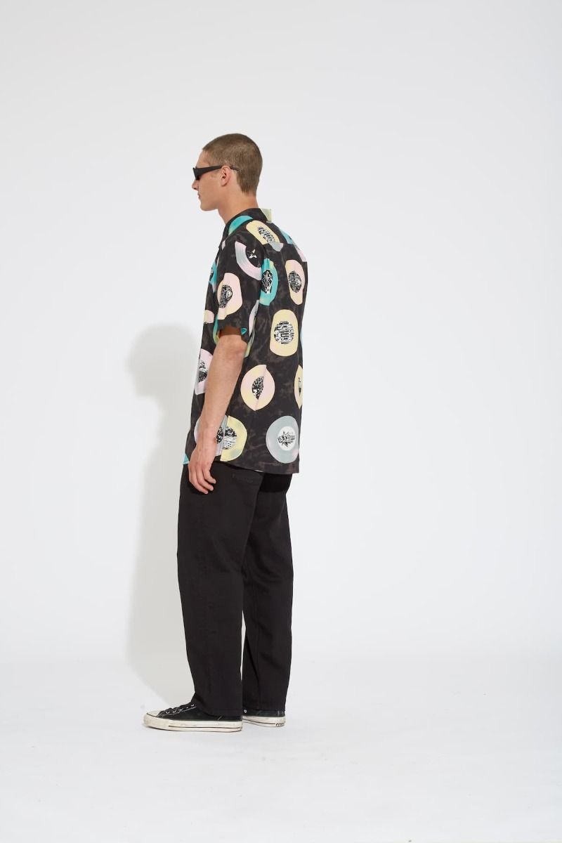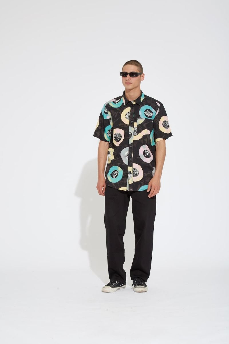 Esta camisa de corte clásico cuenta con manga corta, un bolsillo de parche en el pecho, cierre de botones con logo Volcom, estampado Volcom Entertainment junto con gráficos de LP's, una discreta etiqueta de la marca tejida en el bolsillo y el logo Stone bordado.