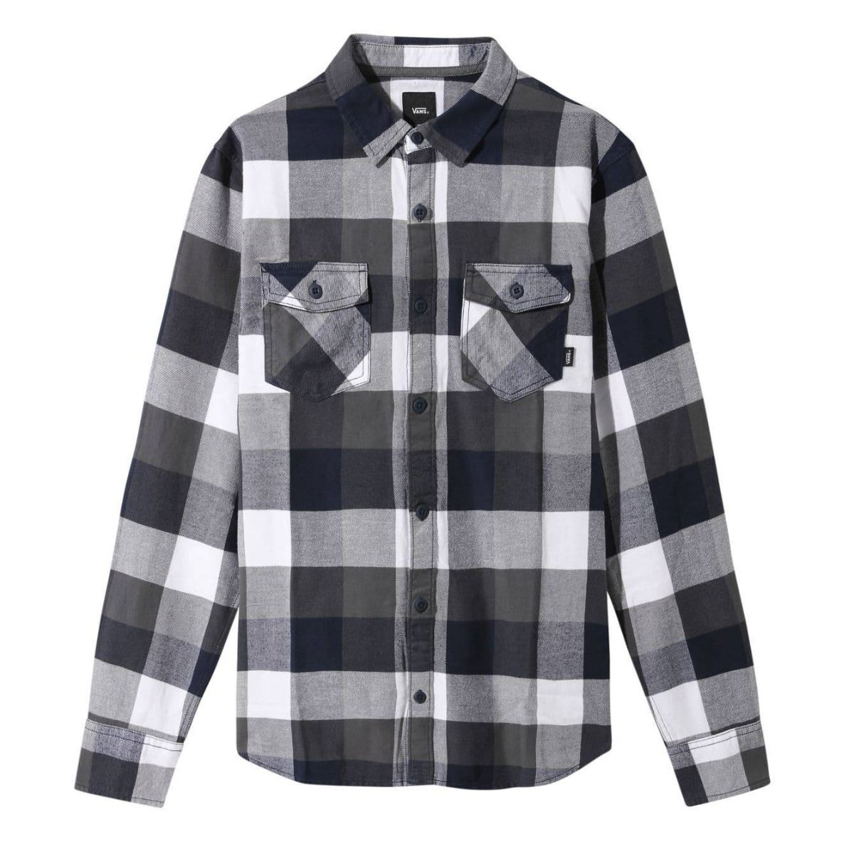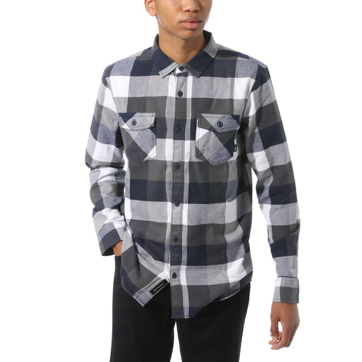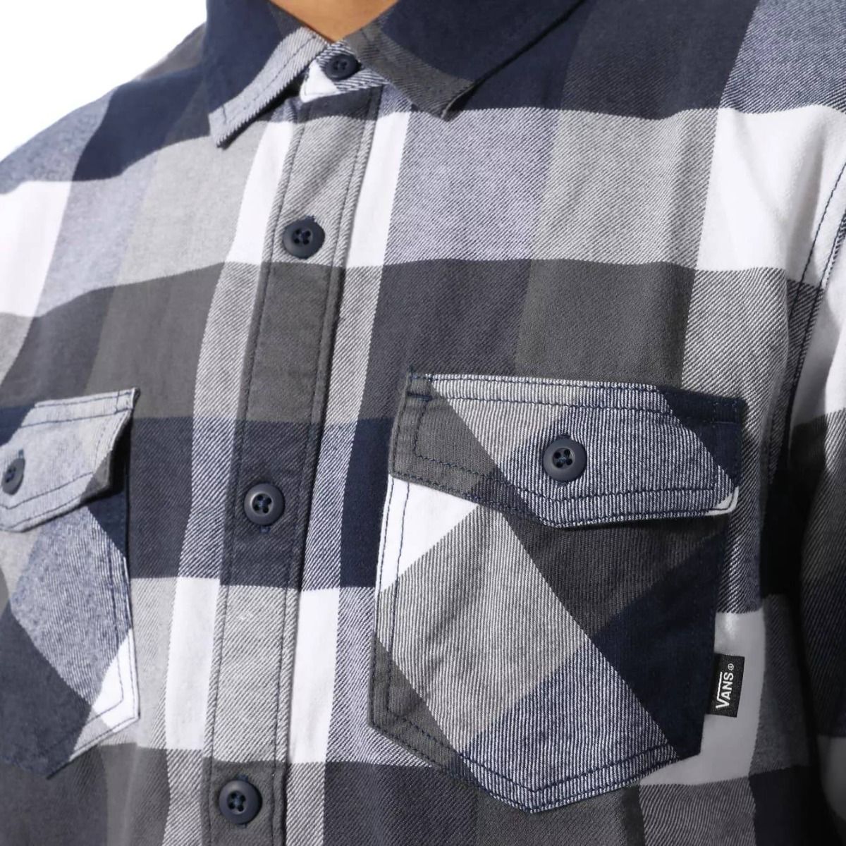 Esta camisa de franela ajustada cuenta con cuello abotonado, manga larga, bolsillos con solapas y cierre de botón en el pecho. y el logotipo de Vans en una etiqueta cosida en el bolsillo izquierdo.