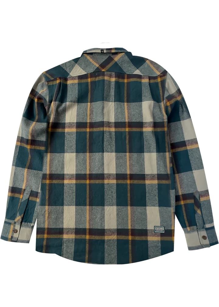 La camisa de franela Creators Eco LS Flannel azul para hombre tiene una etiqueta de garantía Vissla en el interior.