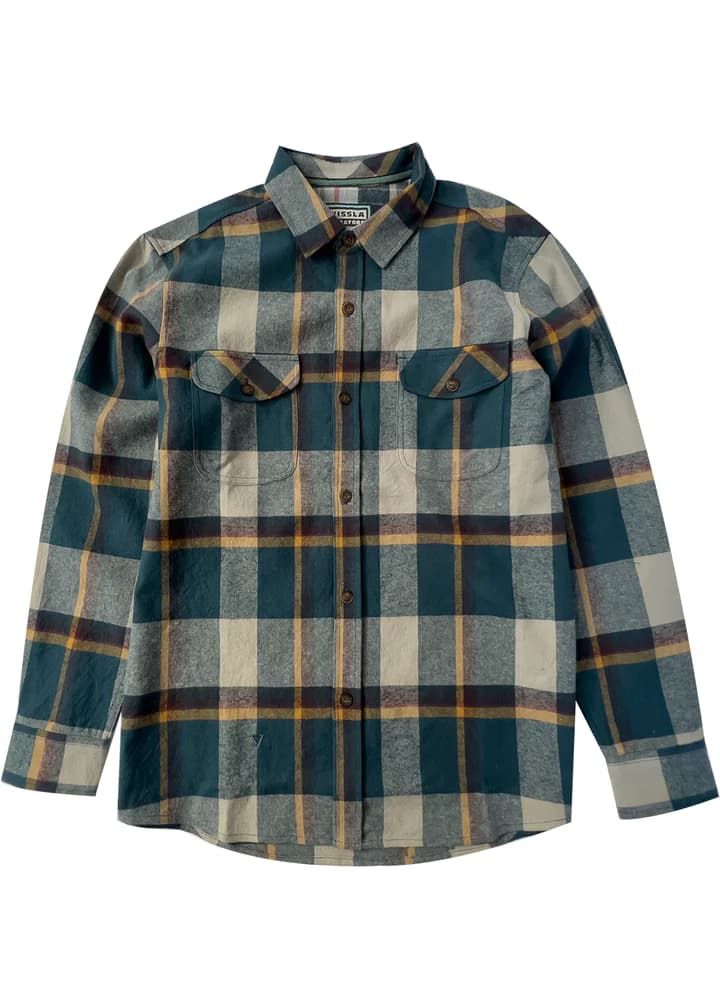 La camisa de manga larga para hombre Creators Eco Flannel con estampado a cuadros en azul (Deep Water) de Vissla está confeccionada con mezcla ecológica de algodón orgánico y cáñamo reciclado.