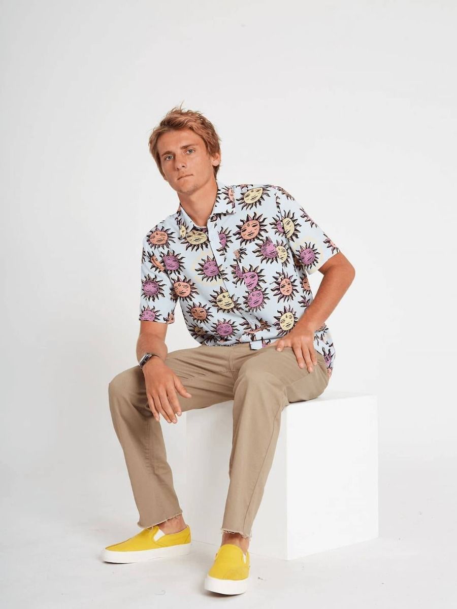 Esta camisa de corte clásico perteneciente a la colección Ozzy de Volcom cuenta con cuello abierto, manga corta, cierre de botones y dobladillo ligeramente curvado.