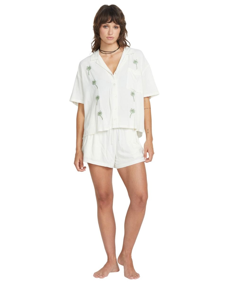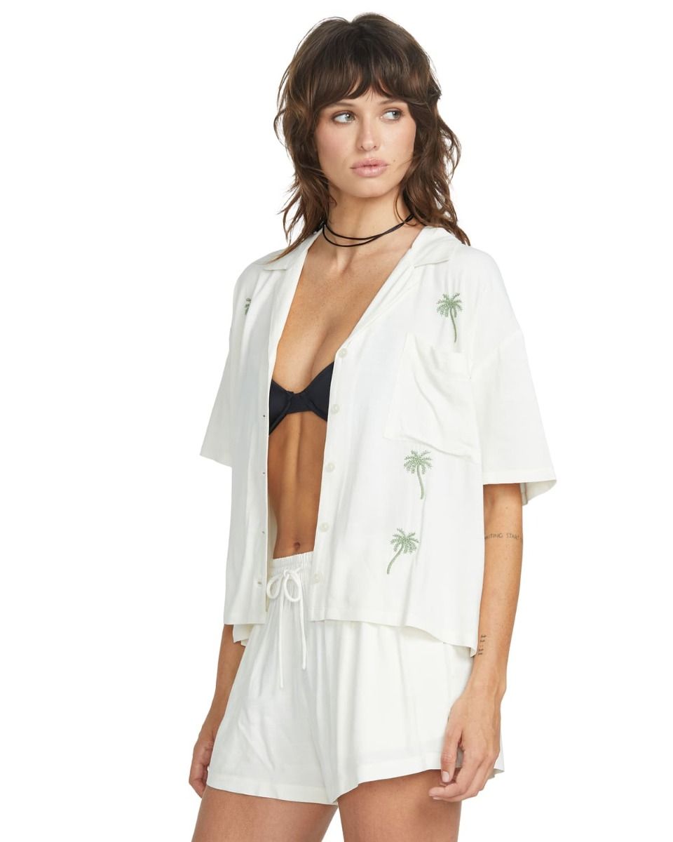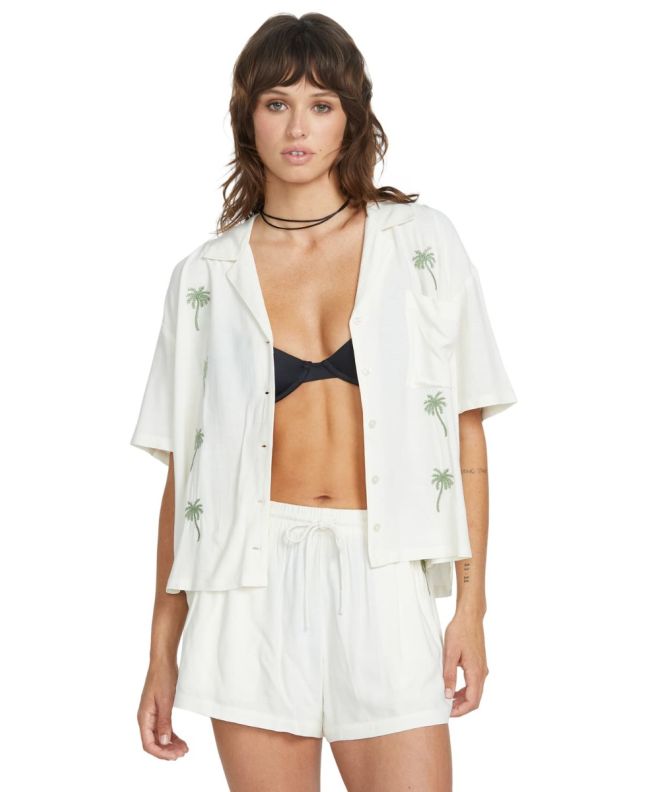 Camisa Volcom Sun Stunner Blanco Hueso para mujer con estampado de palmeras, corte relaxed y tejido ligero. Ideal para un look surfero urbano.