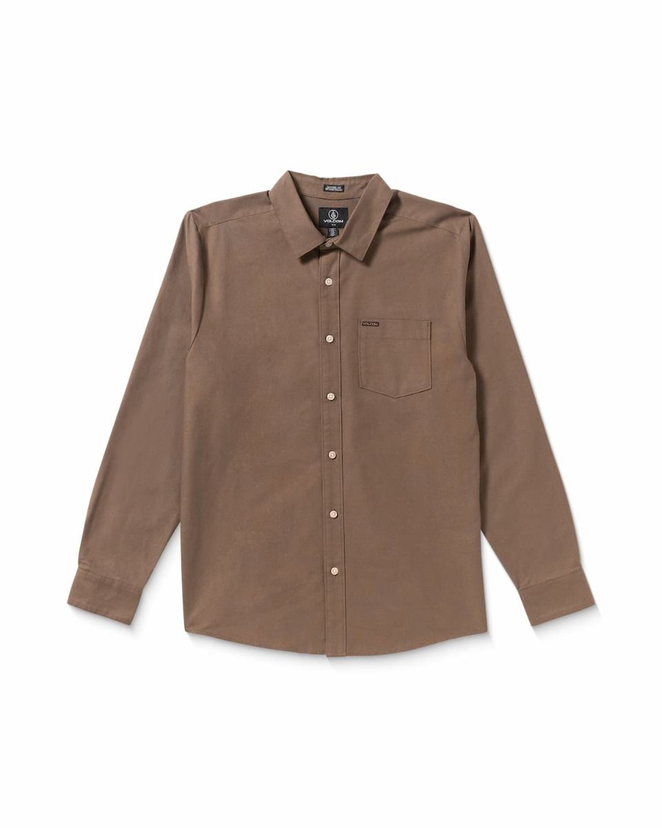 Camisa de manga larga Volcom Veeco Oxford para hombre en marrón piedra, 100% algodón y corte clásico.