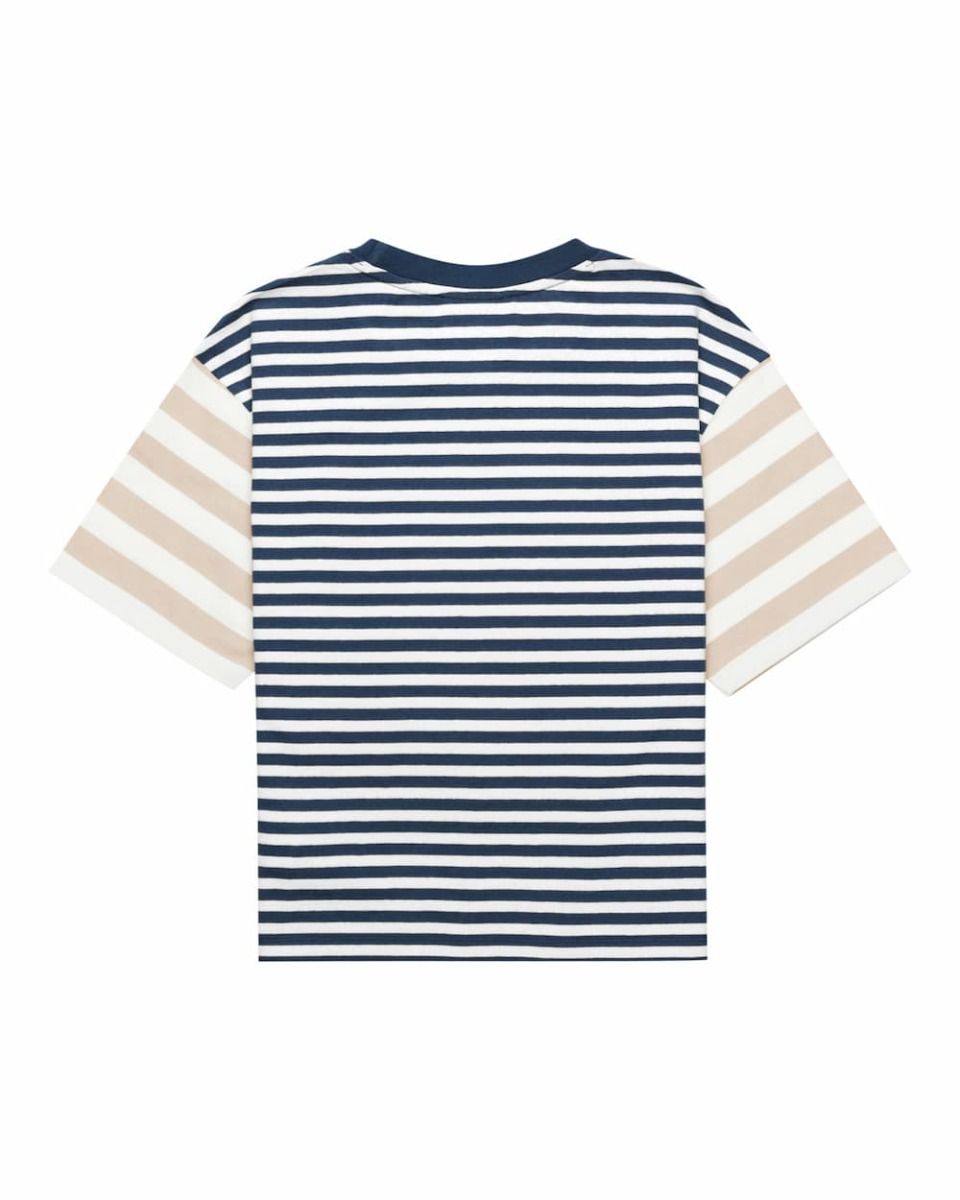Este camiseta sostenible cuenta con corte cuadrado, cuello redondo, manga corta y estampado con rayas multicolor teñidas en hilo.