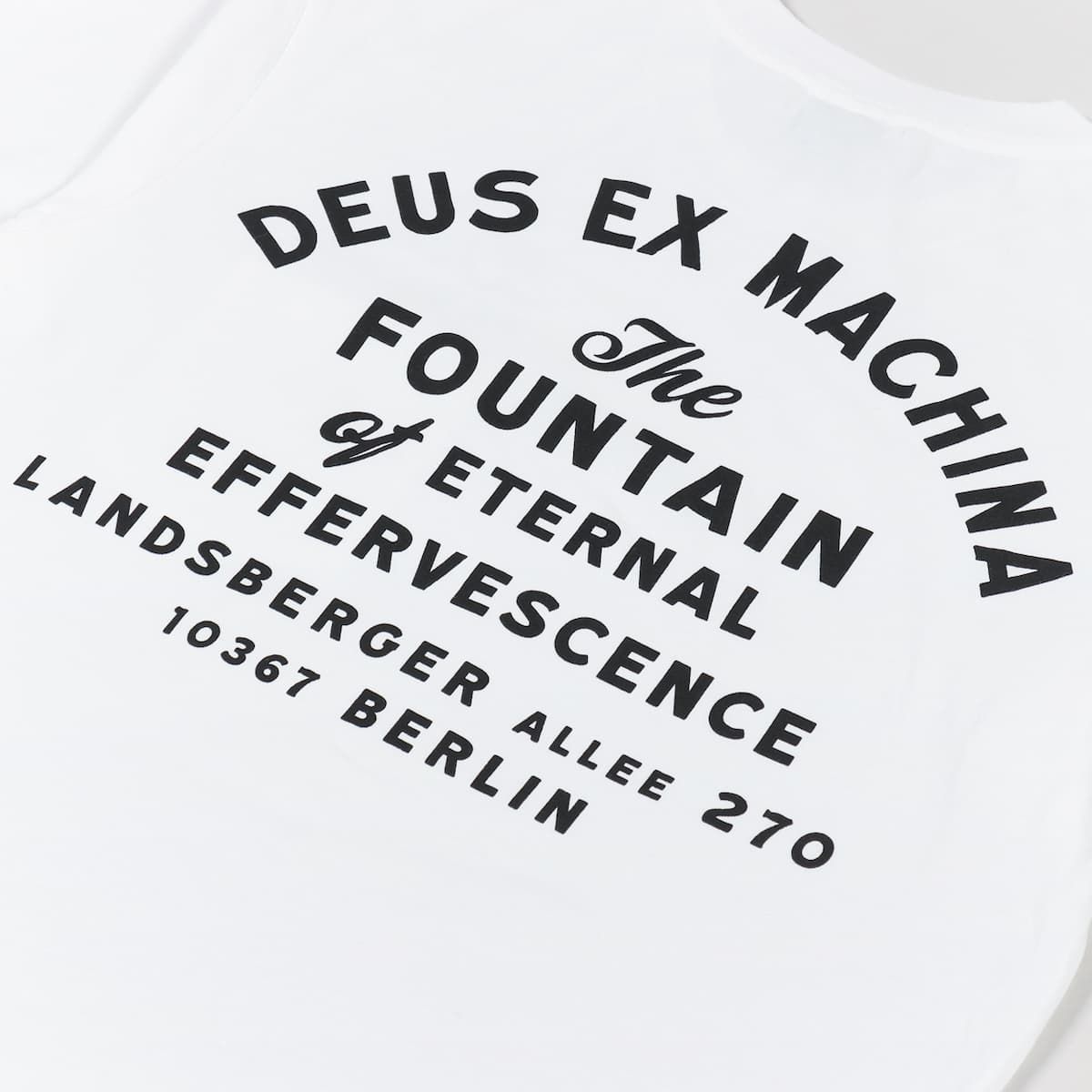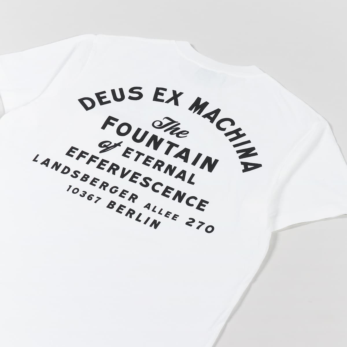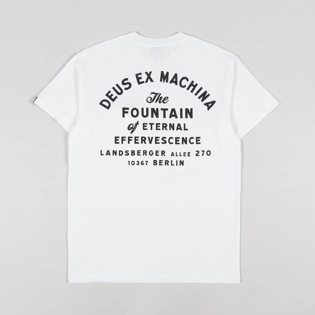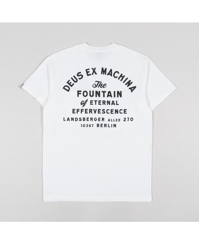 Esta camiseta de ajuste regular cuenta con cuello redondo, manga corta, bolsillo en el pecho, el logo de Deus Ex Machina estampado encima del bolsillo y la dirección de la tienda Deus en Berlín serigrafiada en la espalda.