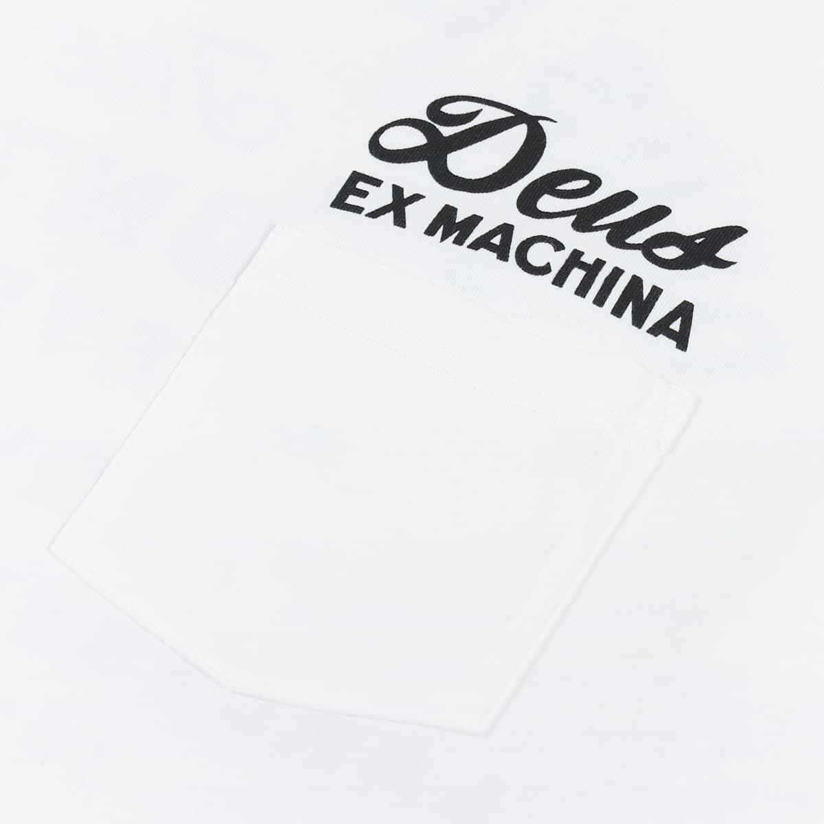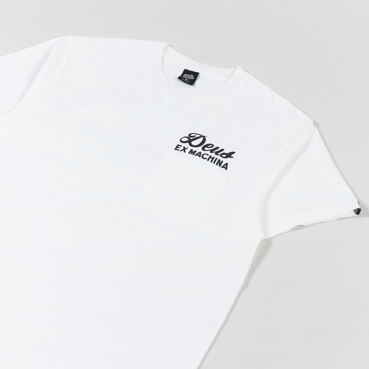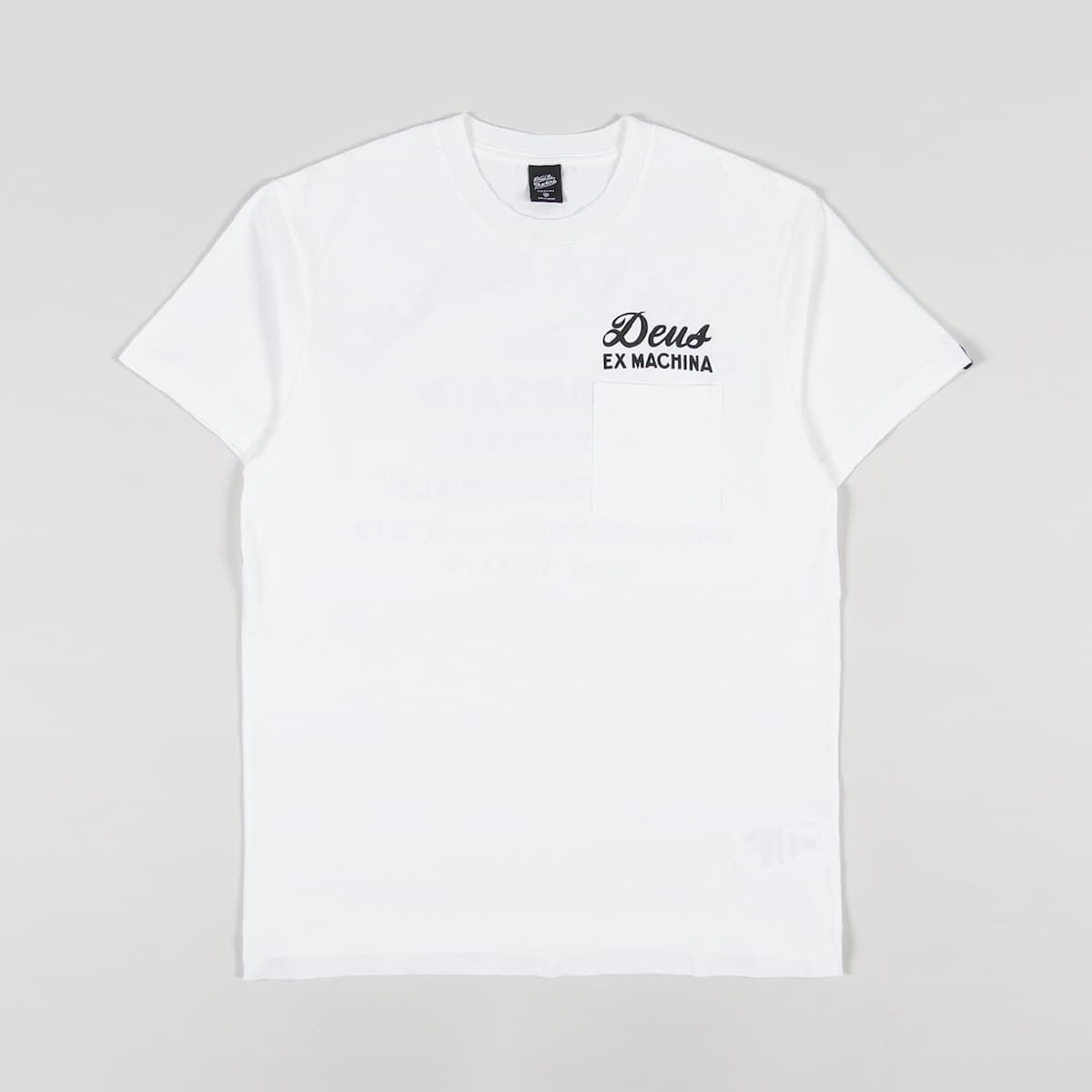 La camiseta de manga corta con bolsillo Berlin Address blanca tiene una etiqueta con el logo de Deus tejida en la manga izquierda.