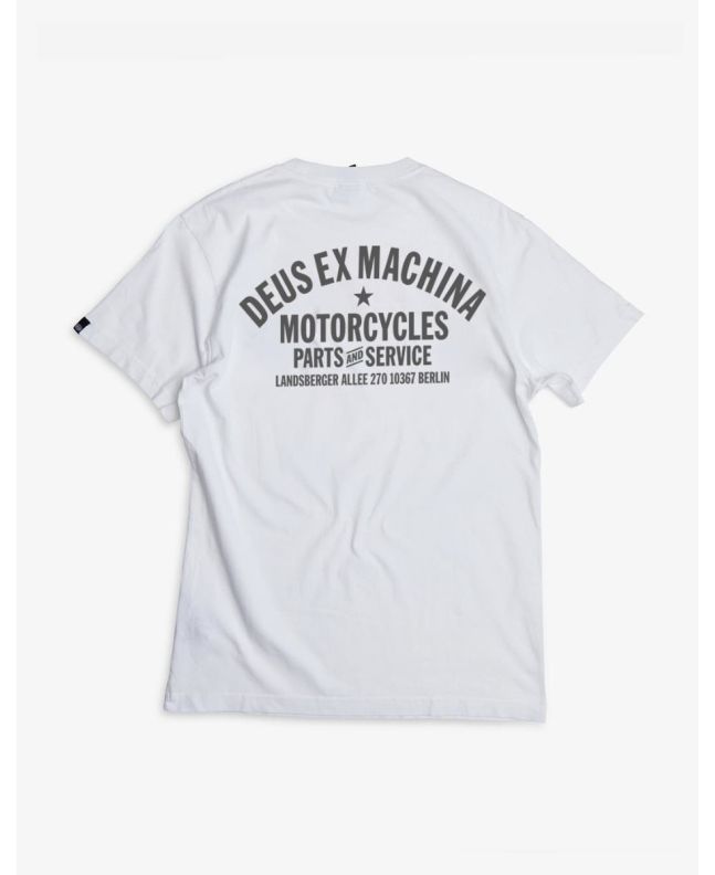 Esta camiseta de ajuste regular, perteneciente a la colección "Deus Ex Machina Classics", cuenta con cuello redondo, manga corta, el logo de Deus estampado en el lado izquierdo del pecho y la leyenda “Deus Ex Machina. Motorcycles. Parts and Service. Landsberger Allee 270 10367 Berlin”impresa en la espalda.