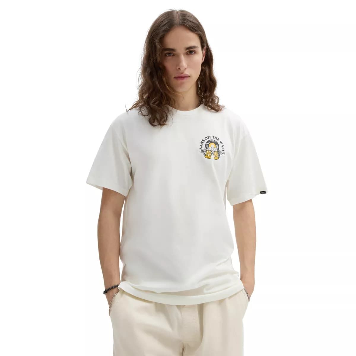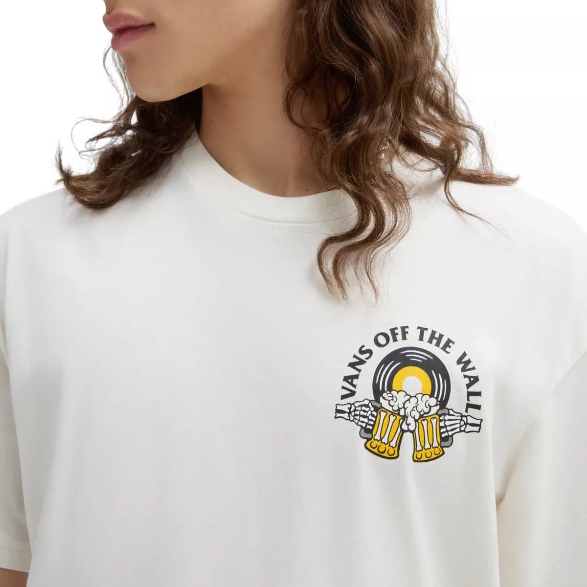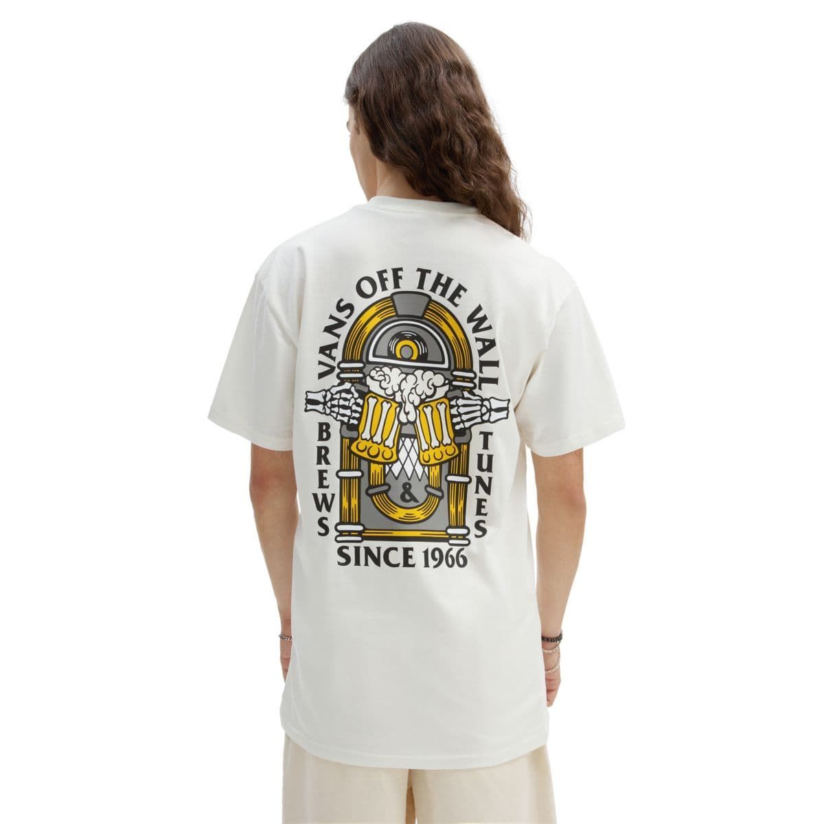 Esta divertida camiseta de corte clásico cuenta con cuello redondo, manga corta, un gráfico de manos de esqueleto brindando con unas cervezas junto con la inscripción "Vans Off The Wall. Brews Tunes. Since 1966" el lado izquierdo del pecho y en la espalda.