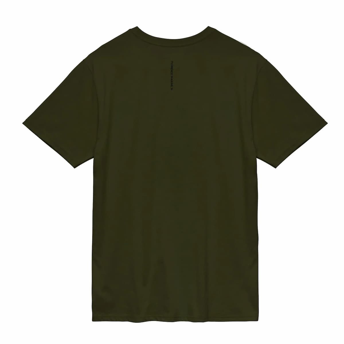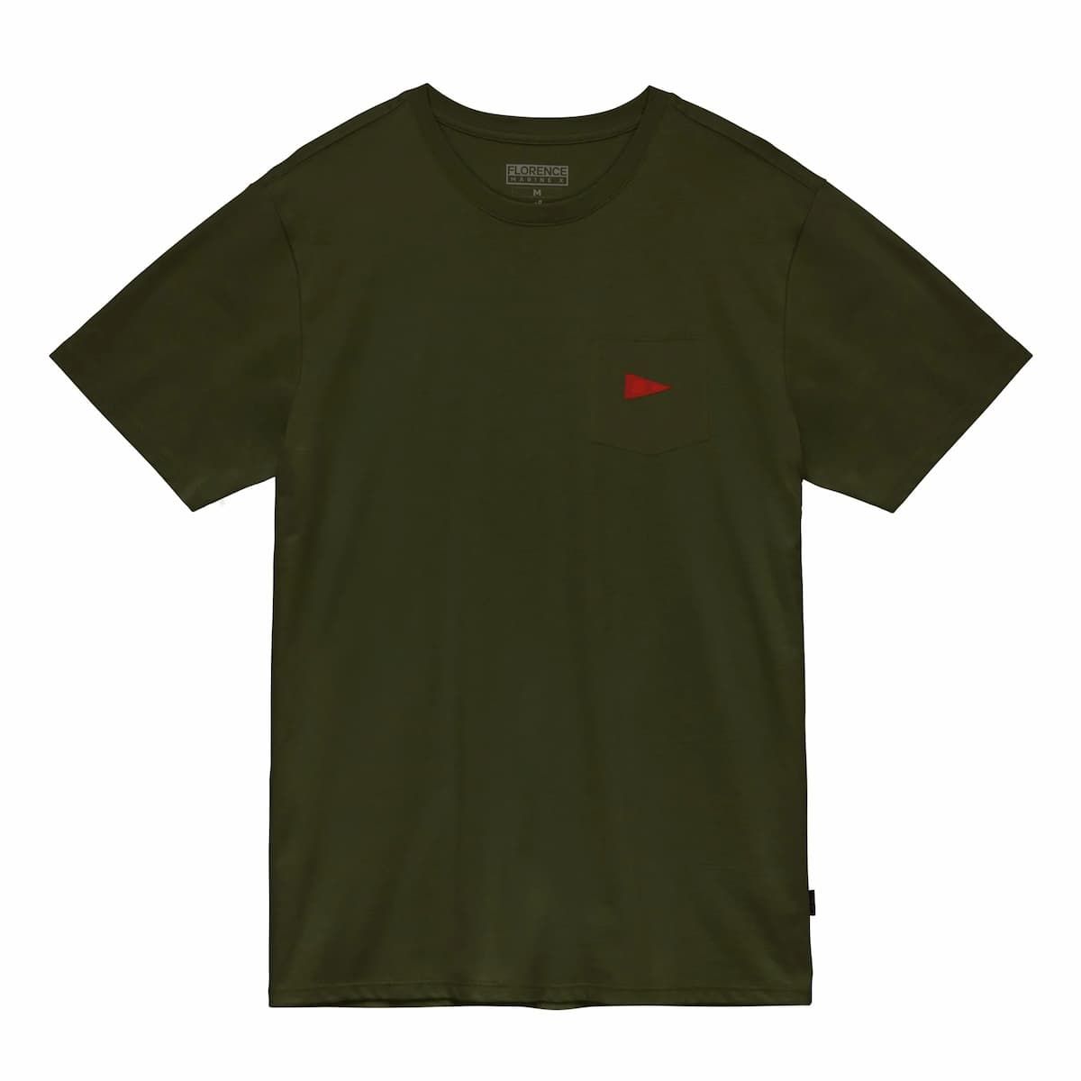 La camiseta orgánica con bolsillo Burgee Organic Pocket verde oliva para hombre tiene un sello de garantía Florence Marine X en el cuello interior.