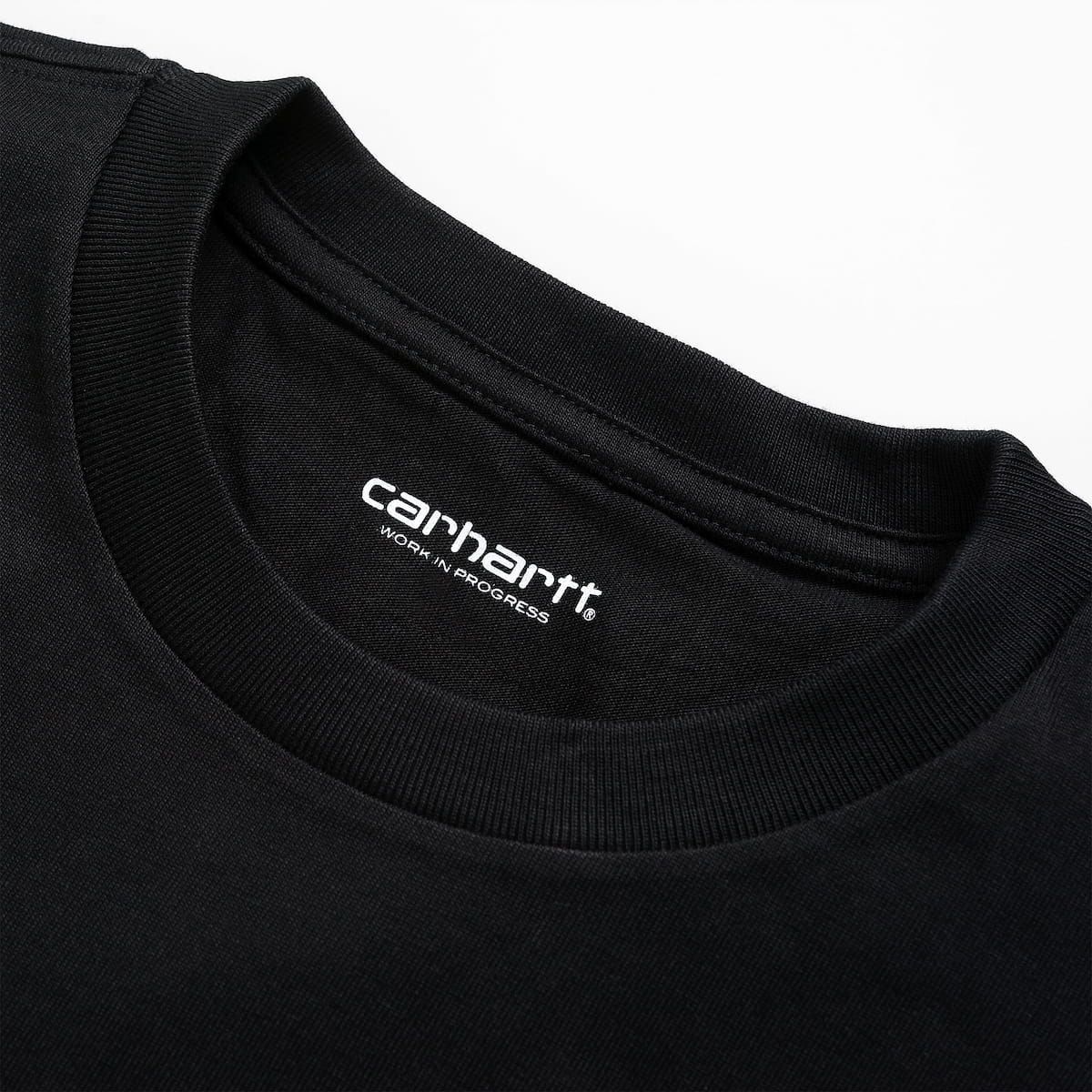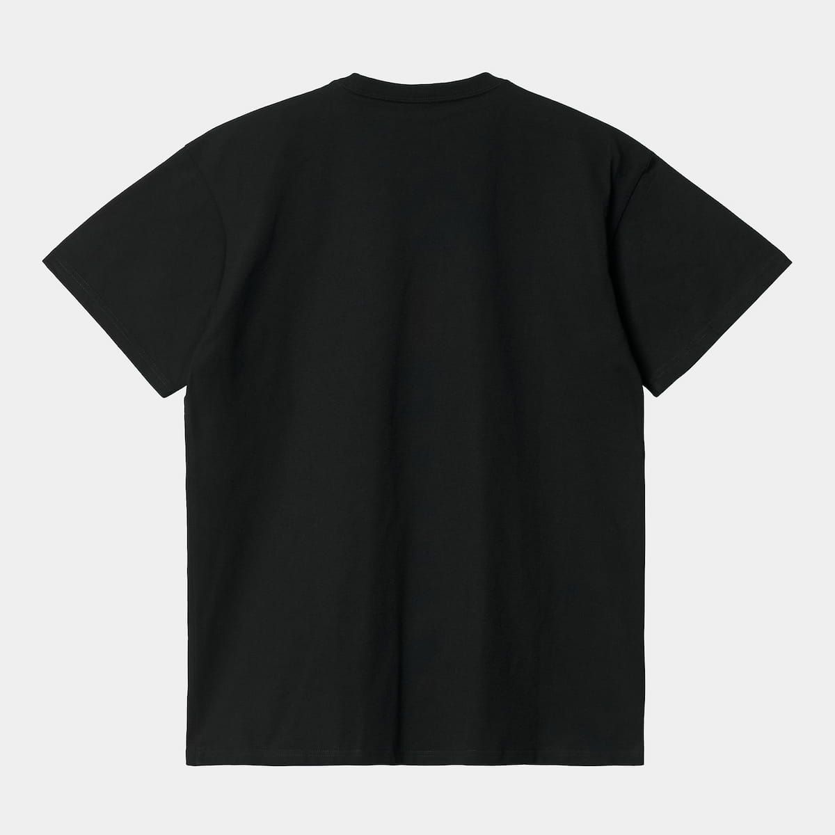 Esta camiseta negra básica de ajuste holgado cuenta con cuello redondo, manga corta y el logo de la "C" de Carhartt bordado en dorado en el lado izquierdo del pecho.