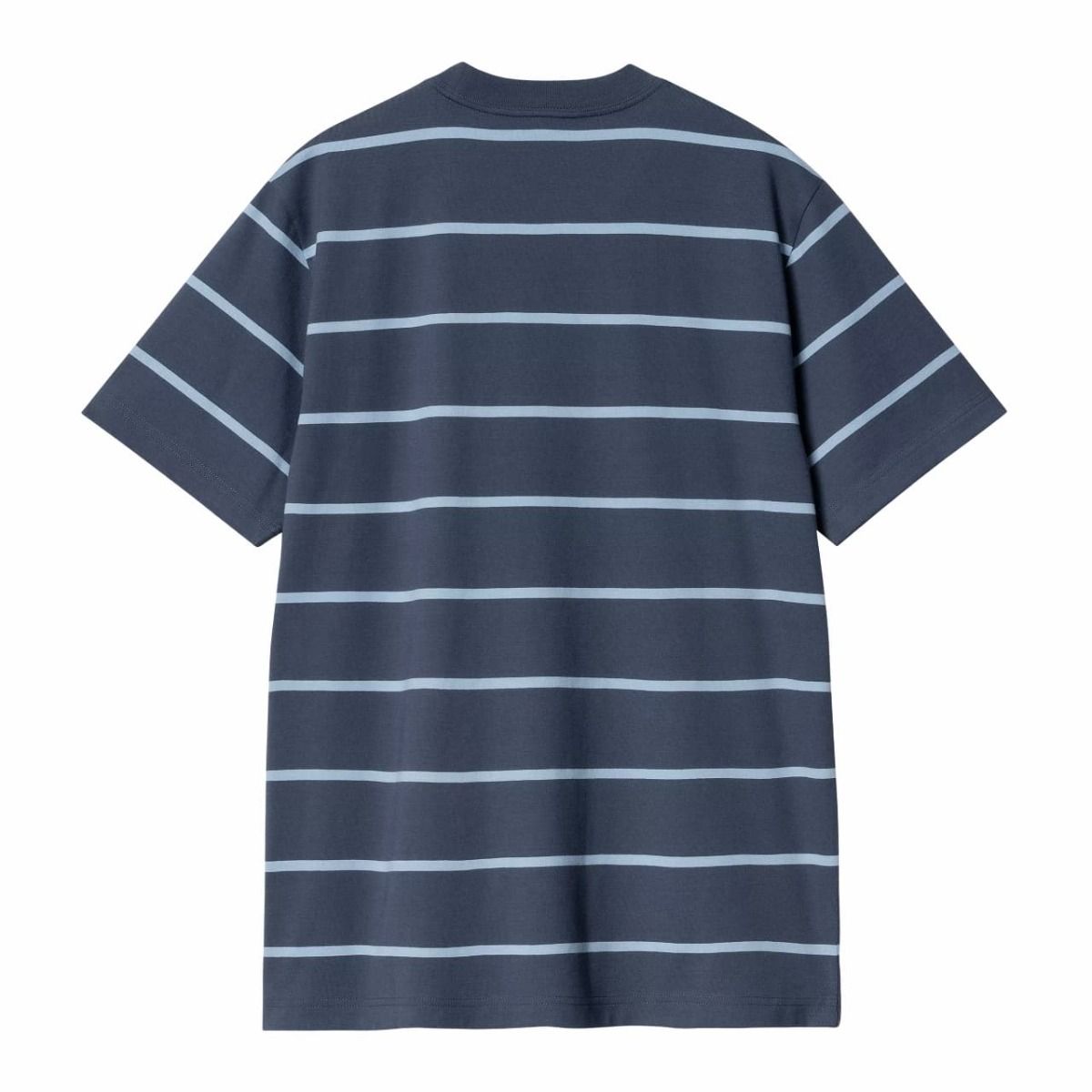 La camiseta con bolsillo para hombre S/S Aiken Pocket T-Shirt en tono azul marino con estampado a rayas (Aiken Stripe-Dusky Blue) de Carhartt WIP está confeccionada con 100% tejido en punto jersey de algodón sencillo (205g/m2).