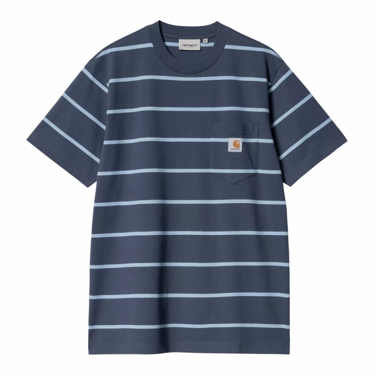 Esta camiseta azulada de ajuste regular para hombre cuenta con cuello redondo, manga corta, bolsillo en el pecho, hilo teñido y una etiqueta cuadrada con el logo de Carhartt tejida en el bolsillo.