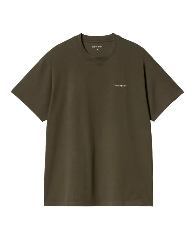 Camiseta de manga corta Carhartt WIP Script Embroidery en color verde tortuga con el logo rosa claro para hombre