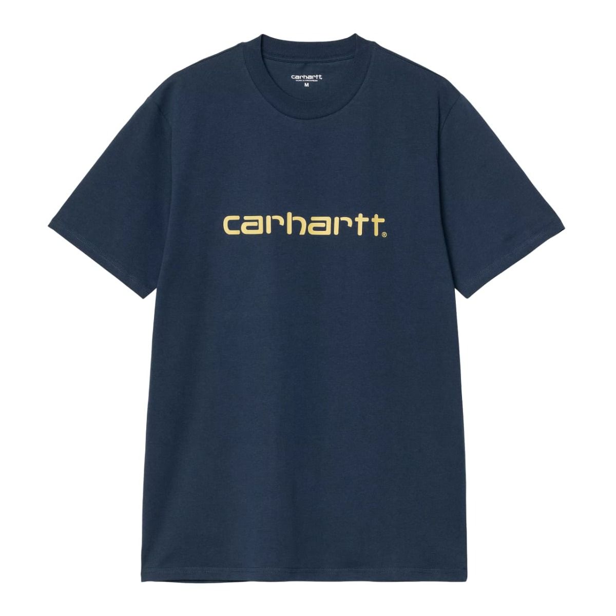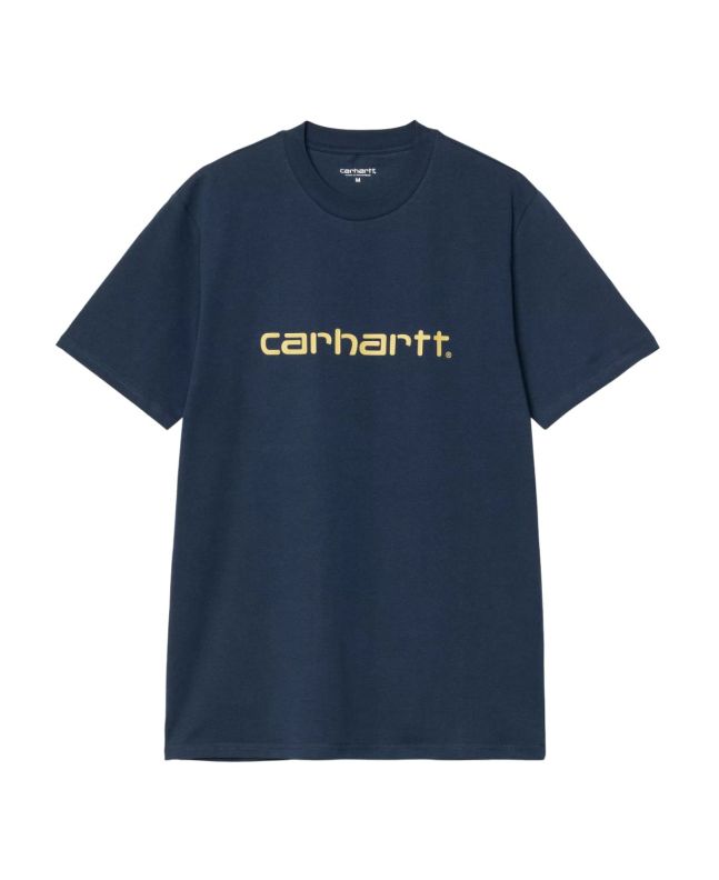 Esta camiseta clásica color azul tinta de ajuste regular para hombre cuenta con cuello redondo, manga corta y el logo en texto de Carhartt impreso en color amarillo en la parte delantera.