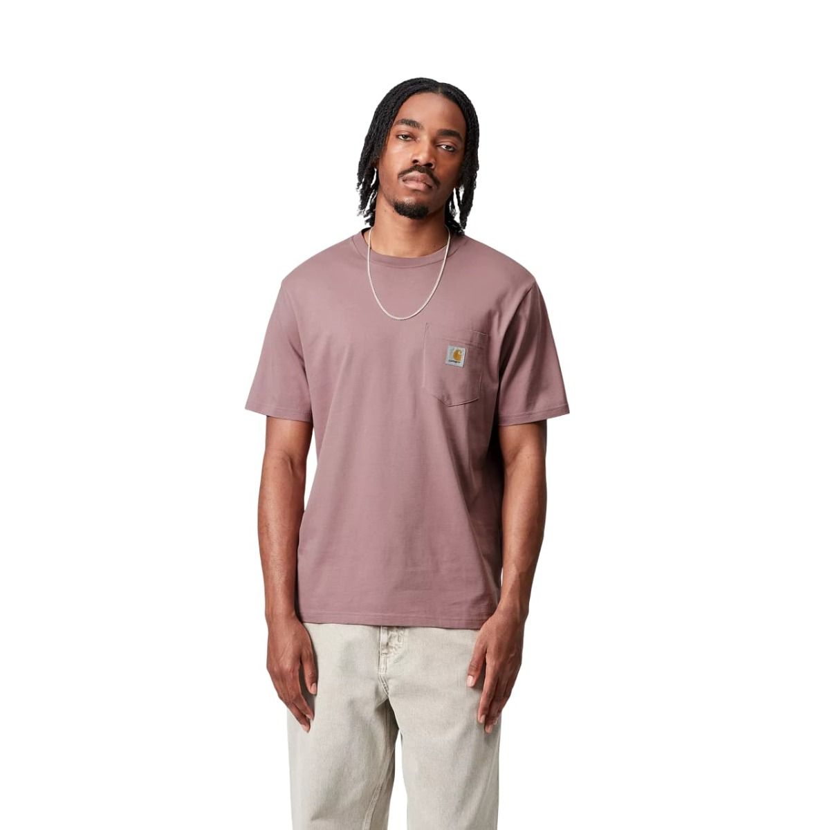 Camiseta de manga corta Carhartt WIP Pocket T-Shirt para hombre en color Rosa Daphne. Algodón 100%, corte regular y bolsillo con etiqueta tejida. Streetwear esencial.