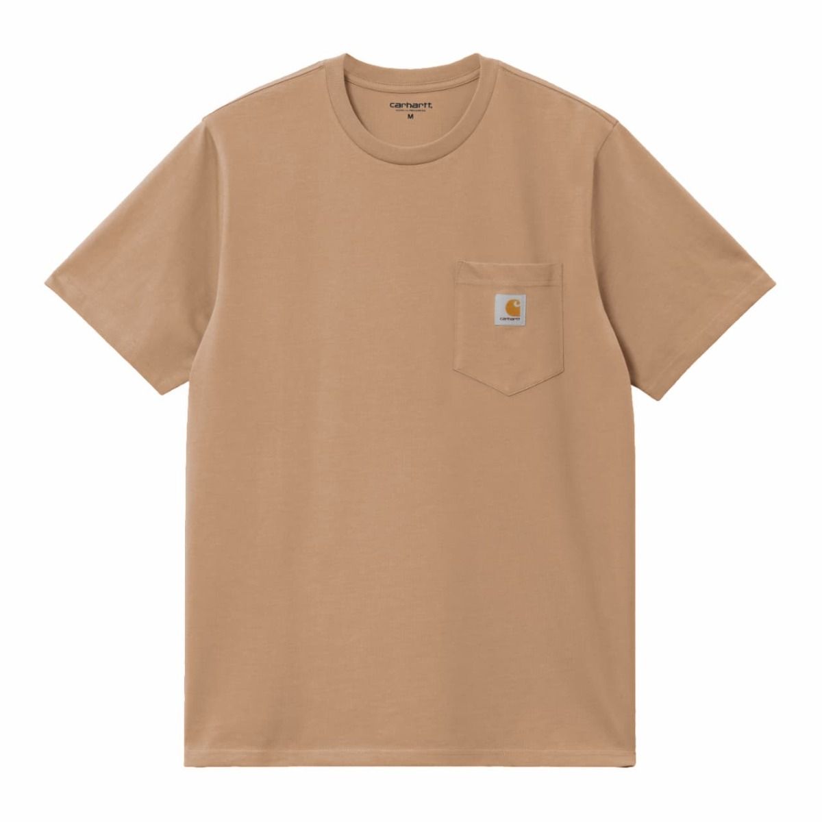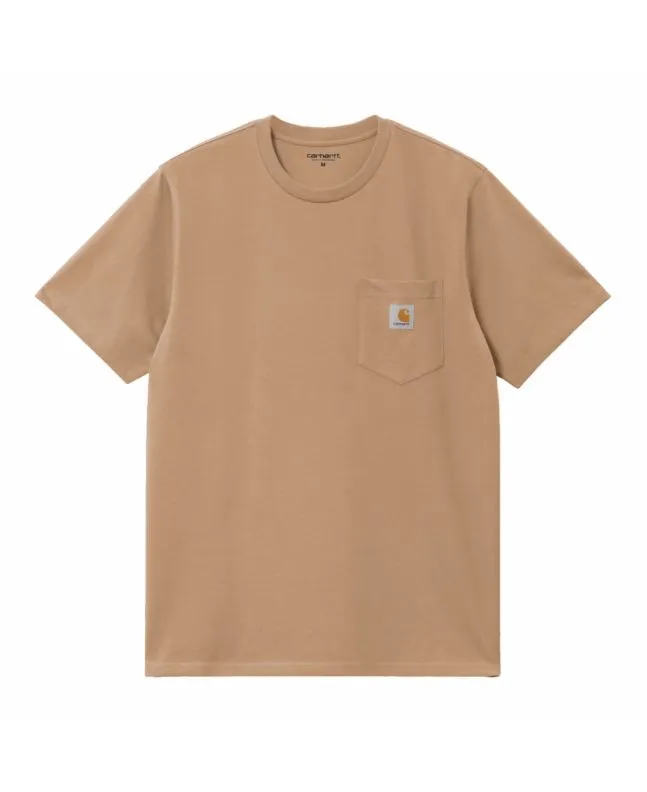 Camiseta Carhartt WIP 100% algodón con bolsillo y logo tejido en color marrón cacahuete. Corte regular y diseño urbano.
