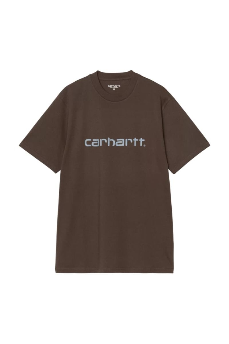 Camiseta Carhartt WIP para hombre con logo Script azul sobre base marrón Vitola. Algodón suave, corte regular y diseño icónico.