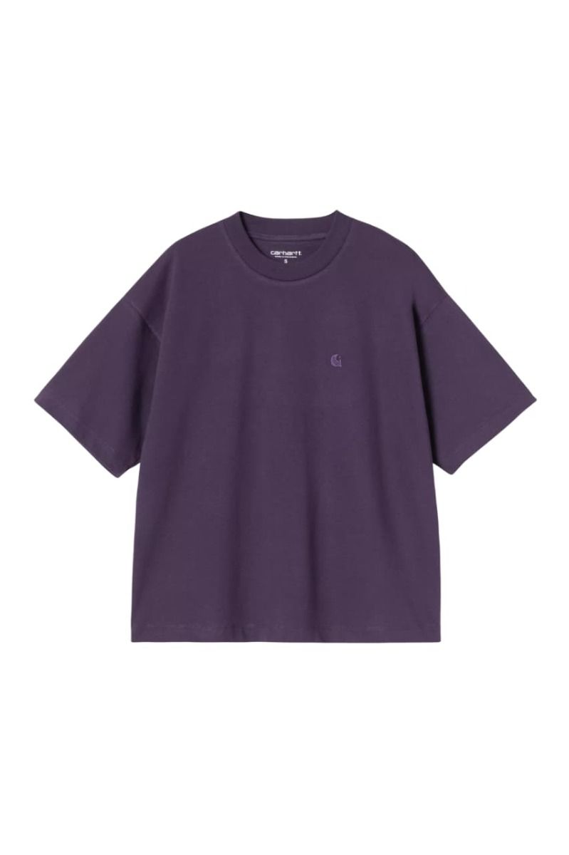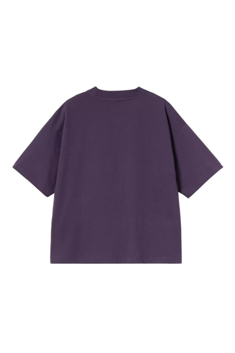 Camiseta de algodón orgánico Carhartt WIP para mujer, corte holgado y largo corto. Logo bordado a tono y acabado minimalista en color morado Lokers.