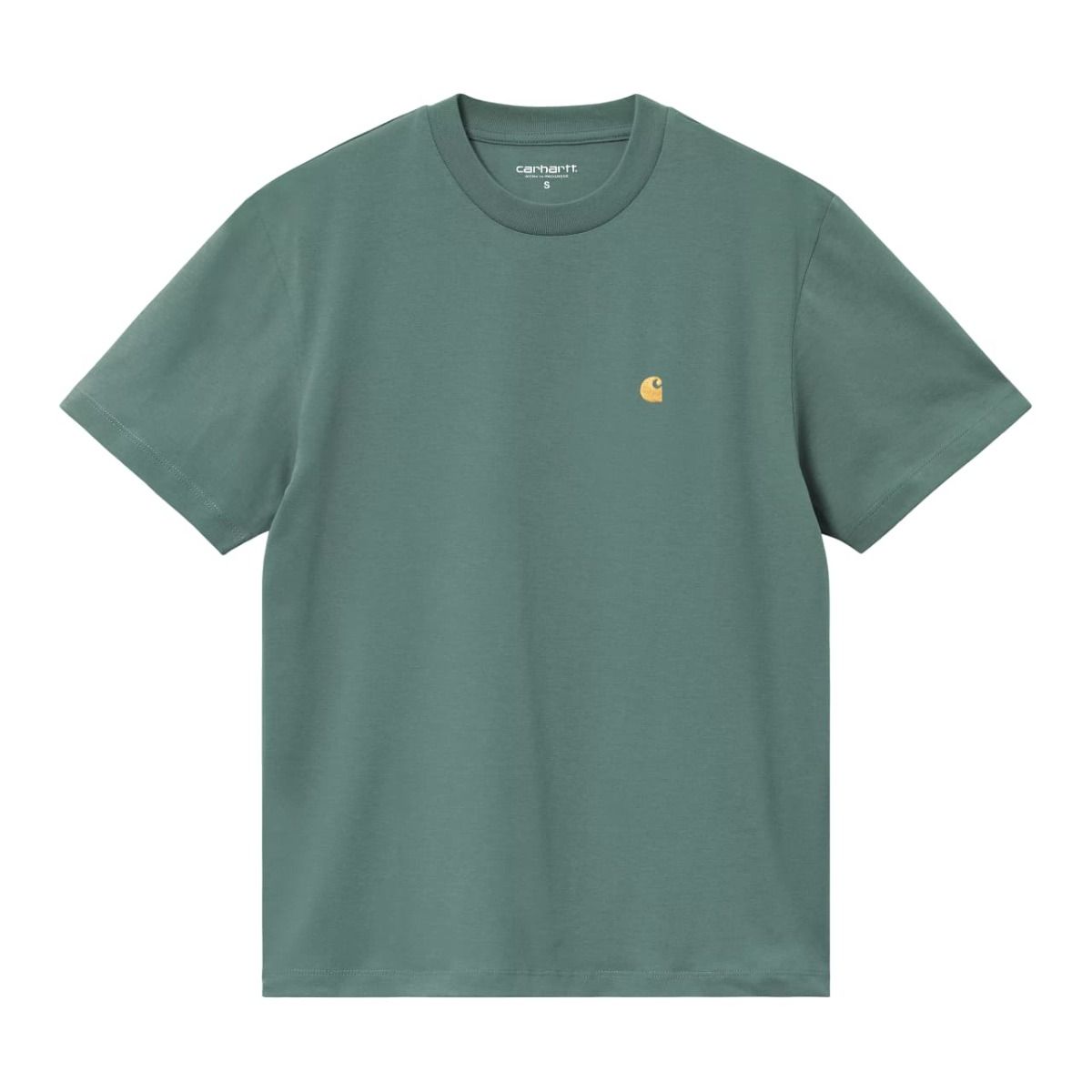 La camiseta para mujer Women's S/S Chase T-Shirt en tono verde pino plateado con el logo en dorado (SIlver Pine-Gold) de Carhartt WIP está confeccionada con 100% tejido punto jersey de algodón orgánico ligero (175g/sqm).