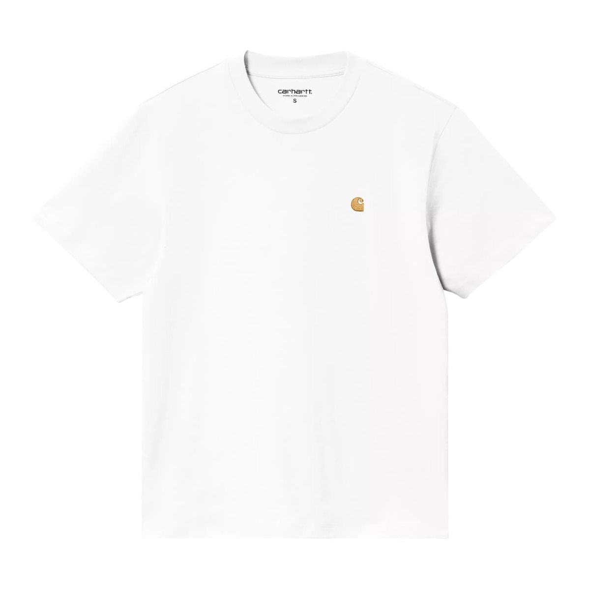 La camiseta para mujer Women's S/S Chase T-Shirt en tono blanco con el logo en dorado (White-Gold) de Carhartt WIP está confeccionada con 100% tejido punto jersey de algodón orgánico ligero (175g/sqm).