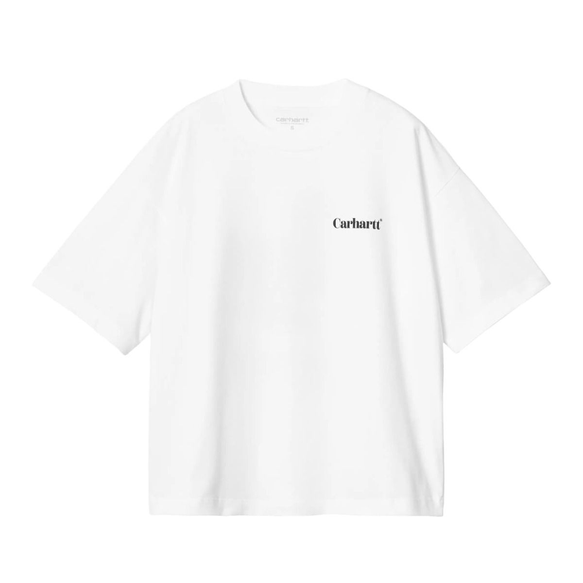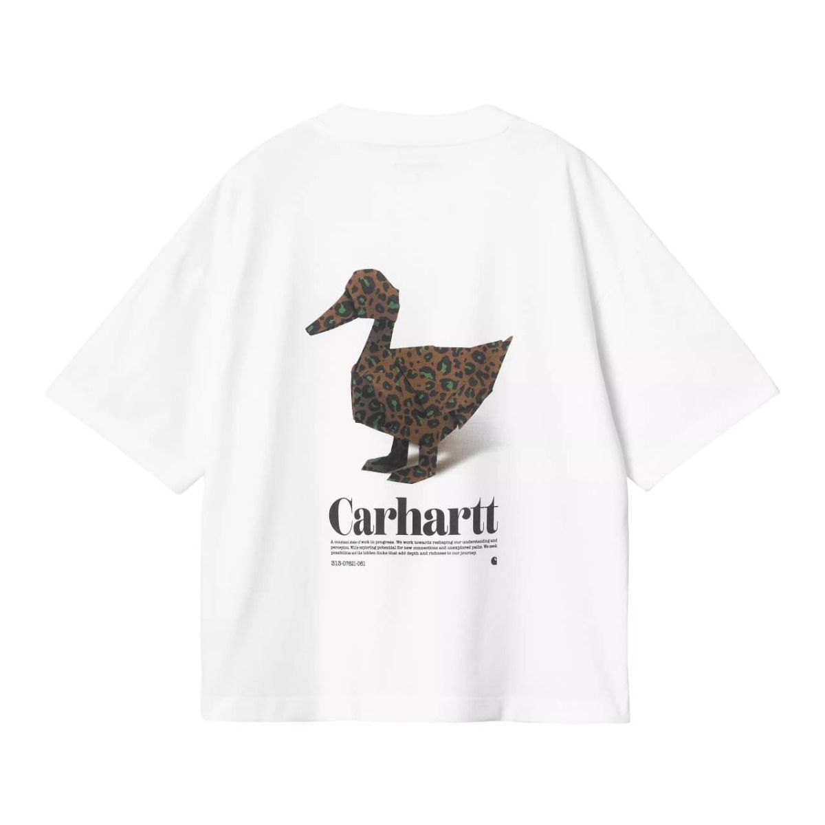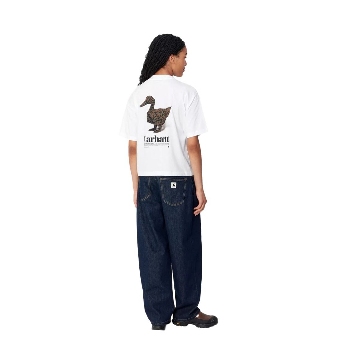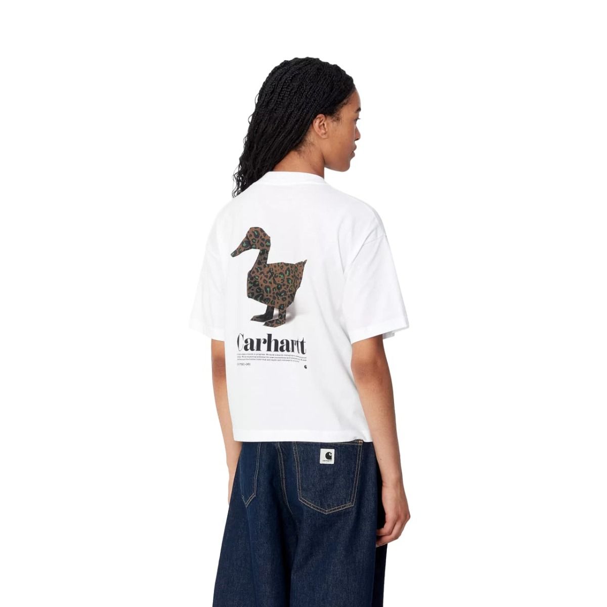 Esta camiseta orgánica blanca para mujer de ajuste holgado cuenta con cuello redondo, manga corta, serigrafiado Carhartt en el lado izquierdo del pecho, junto con un gráfico de un pato estampado en la espalda.
