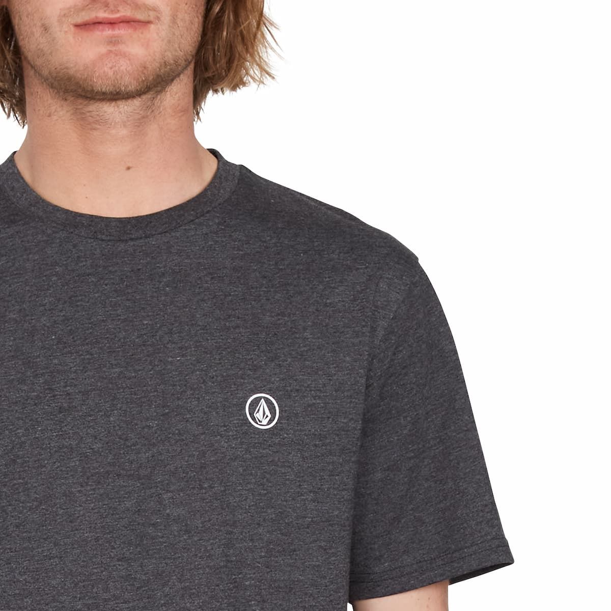 La camiseta de manga corta Circle Blanks color Heather Black para hombre tiene una etiqueta de garantía Volcom tejida en el dobladillo.