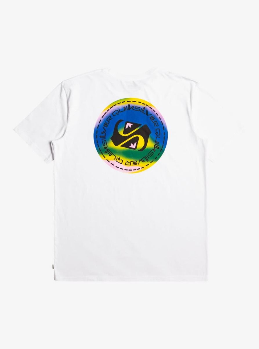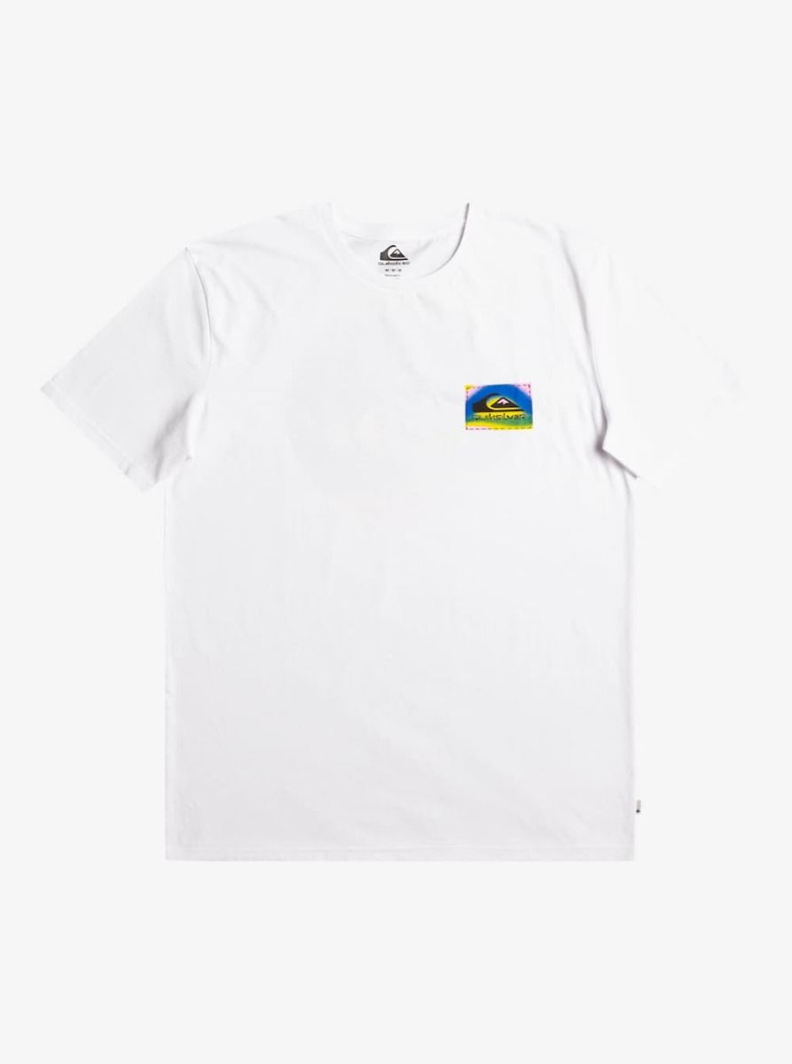 Esta camiseta surfera de corte normal cuenta con cuello redondo, manga corta y el logo de Quiksilver multicolor impreso en el lado izquierdo del pecho y en la espalda.