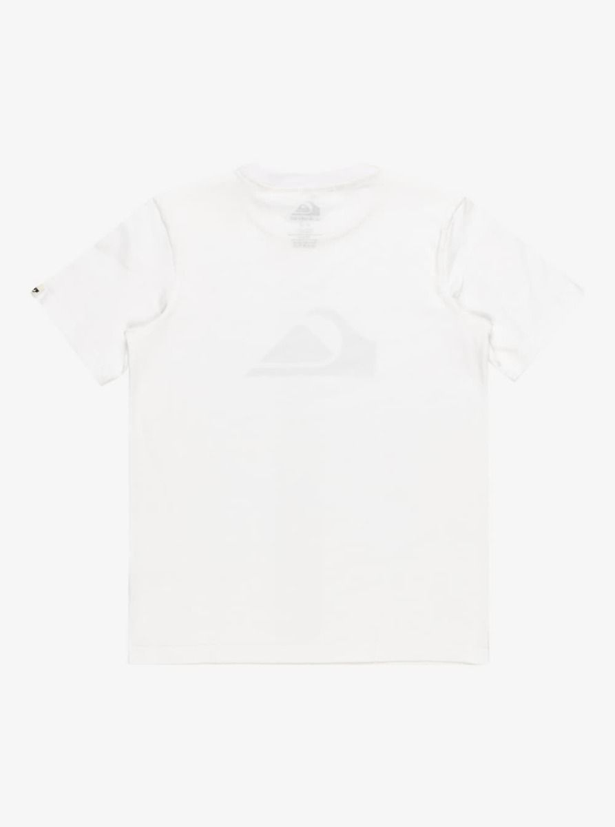 Esta camiseta juvenil blanca presenta corte clásico y cómodo, cuello redondo, manga corta, el logo de la ola y la montaña de Quiksilver serigrafiado en tono negro en la parte delantera, junto con una pequeña etiqueta de la marca tejida en la manga izquierda.