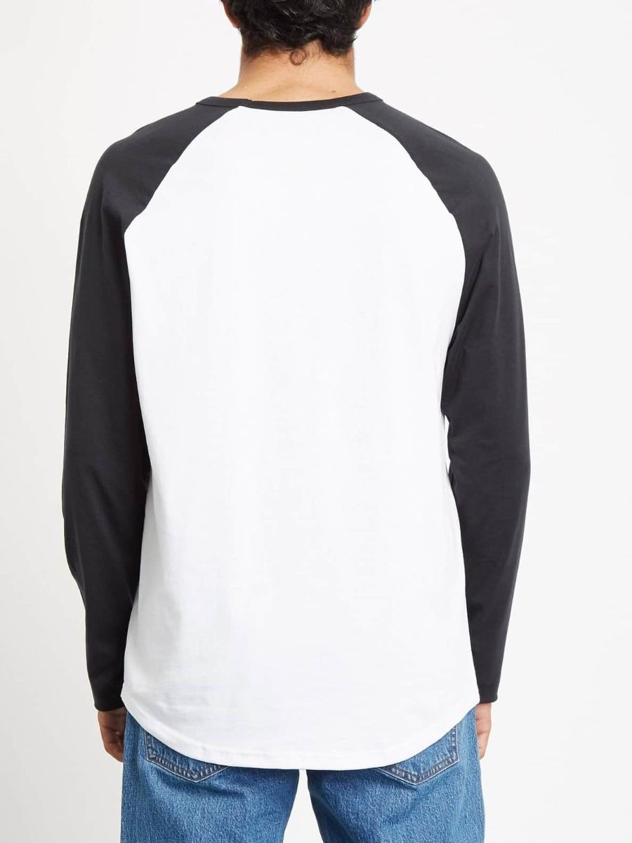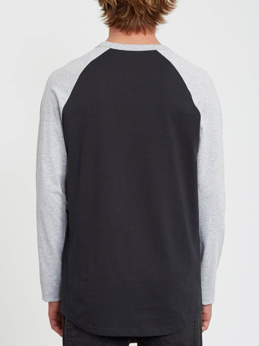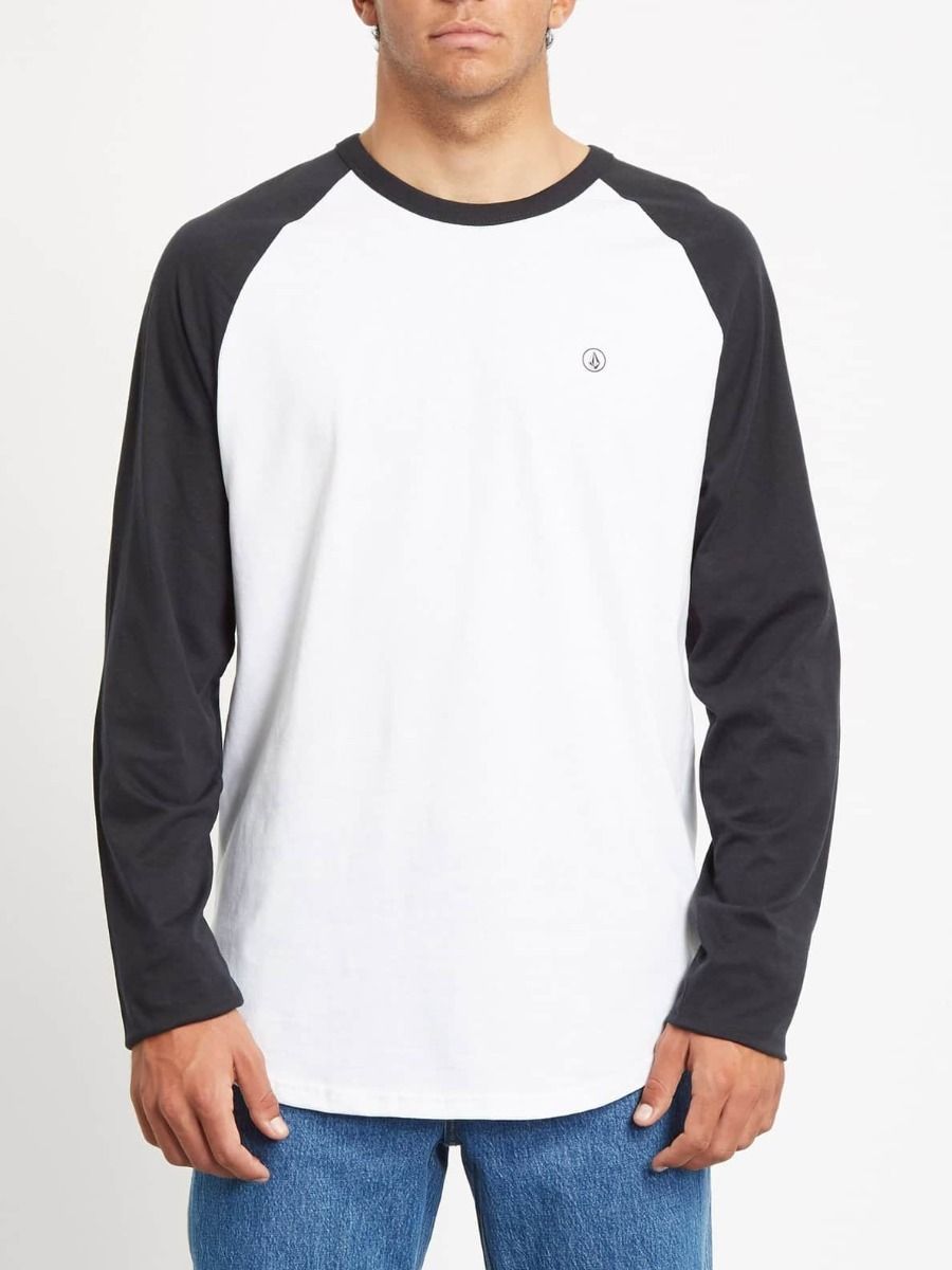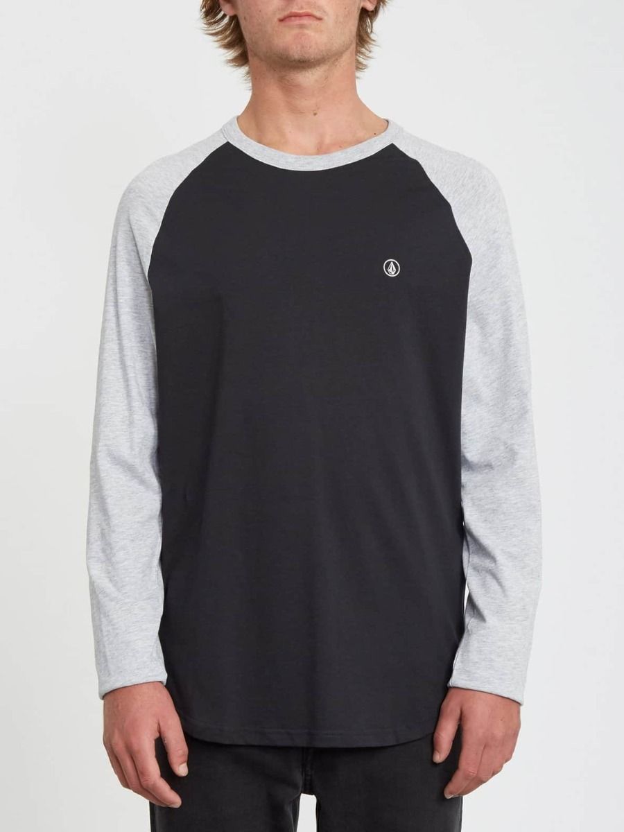 Esta camiseta de corte raglán cuenta con cuello redondo, manga larga, dobladillo ligeramente curvado, estampado serigrafiado Volcom Stone en el pecho y etiqueta Volcom tejida en el bajo delantero.