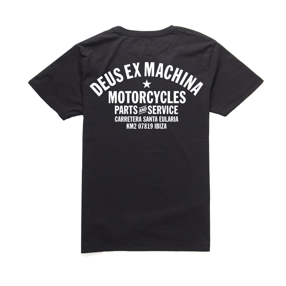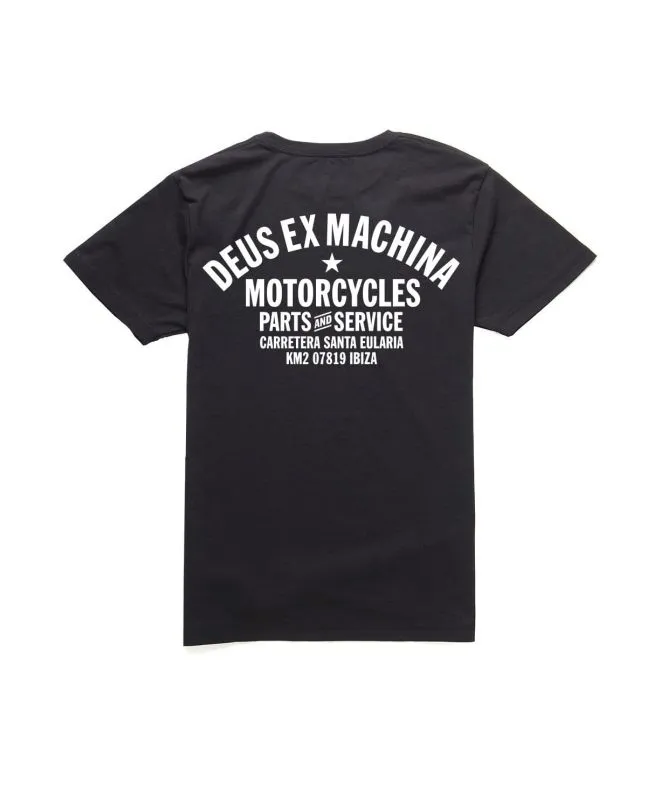 Esta camiseta de ajuste regular, perteneciente a la colección "Deus Ex Machina Classics", cuenta con cuello redondo, manga corta, el logo de Deus estampado en el lado izquierdo del pecho y la leyenda “Deus Ex Machina Motorcycles. Parts and Service. Carretera Santa Eularia, Km 2, 07819 Ibiza" impresa en la espalda.