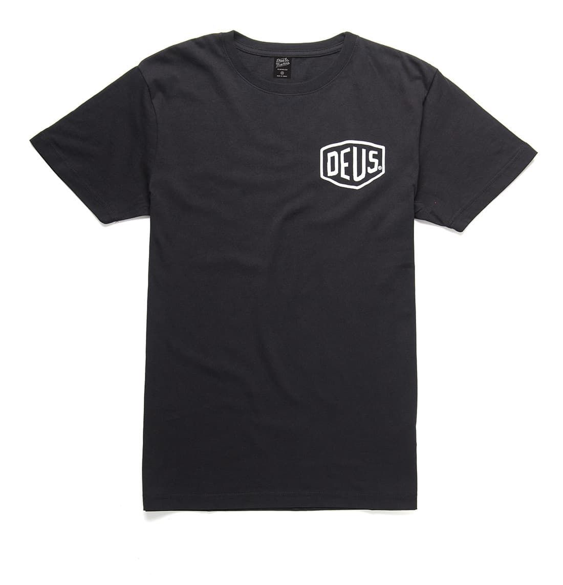 La camiseta de manga corta Ibiza Address Negra para hombre de Deus Ex Machina también está disponible en color azul marino (Navy) y blanco (White).