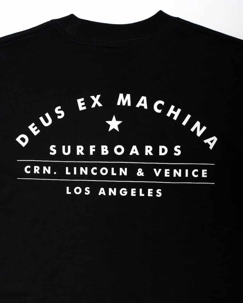 El logo DEUS en blanco contrasta con la base negra del frontal, mientras que en la espalda destaca una gráfica envolvente con la dirección de uno de los hotspots del surf urbano en Los Ángeles: la esquina de Lincoln & Venice.