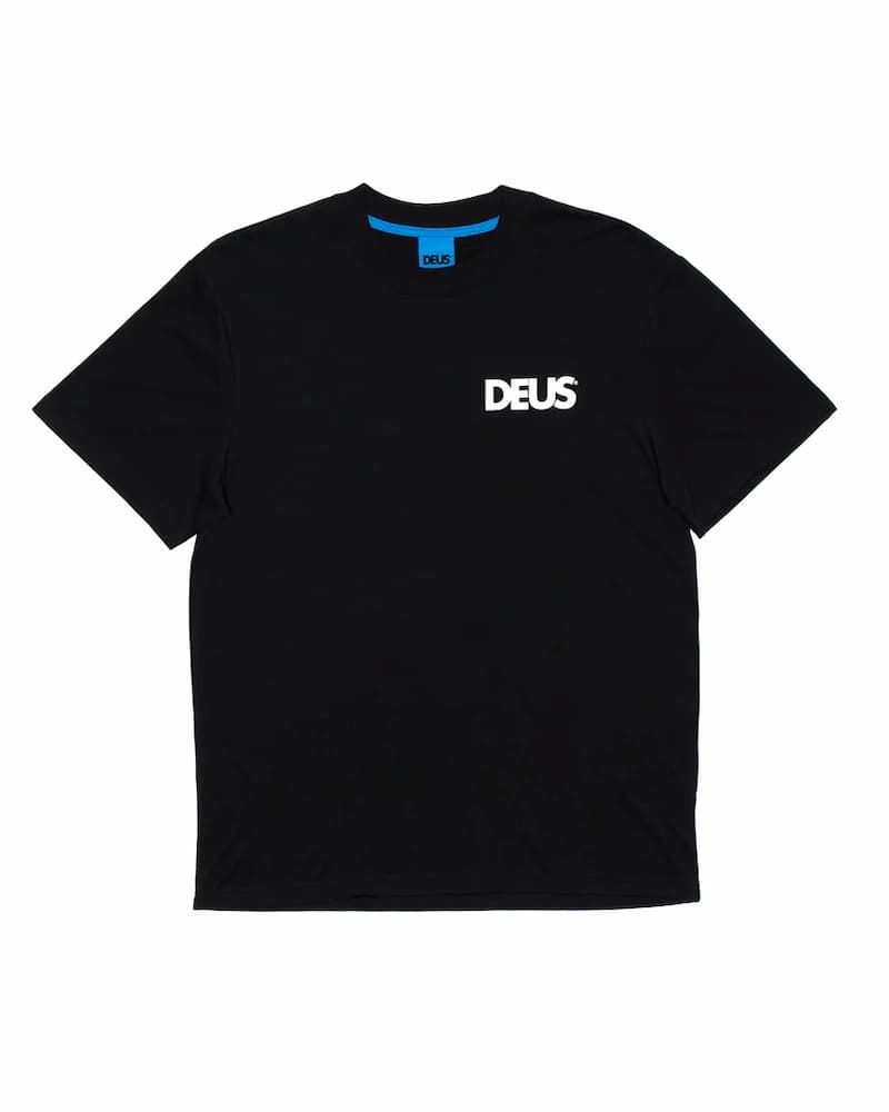 Camiseta Deus negra de corte box fit con logos impresos en blanco. Mezcla técnica de algodón y poliéster, secado rápido, cuello con refuerzo y diseño inspirado en L.A.