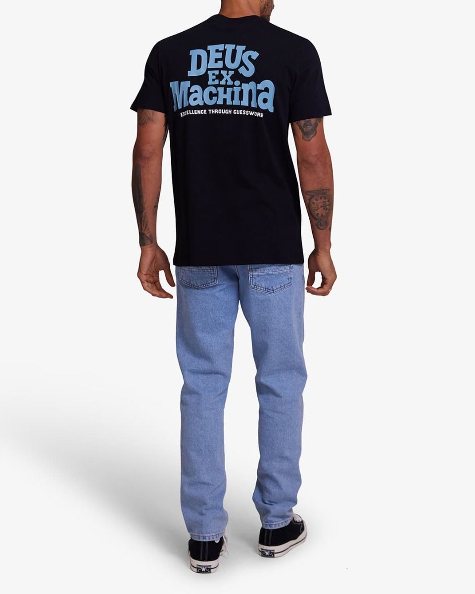 Esta suave camiseta orgánica de ajuste regular cuenta con lavado en prenda, cuello redondo, manga corta, serigrafiado Deus, junto con un gráfico de un bufón haciendo malabares impreso en el lado izquierdo del pecho y la inscripción "Deus Ex Machina. Excellence Through Guesswork" en la espalda.