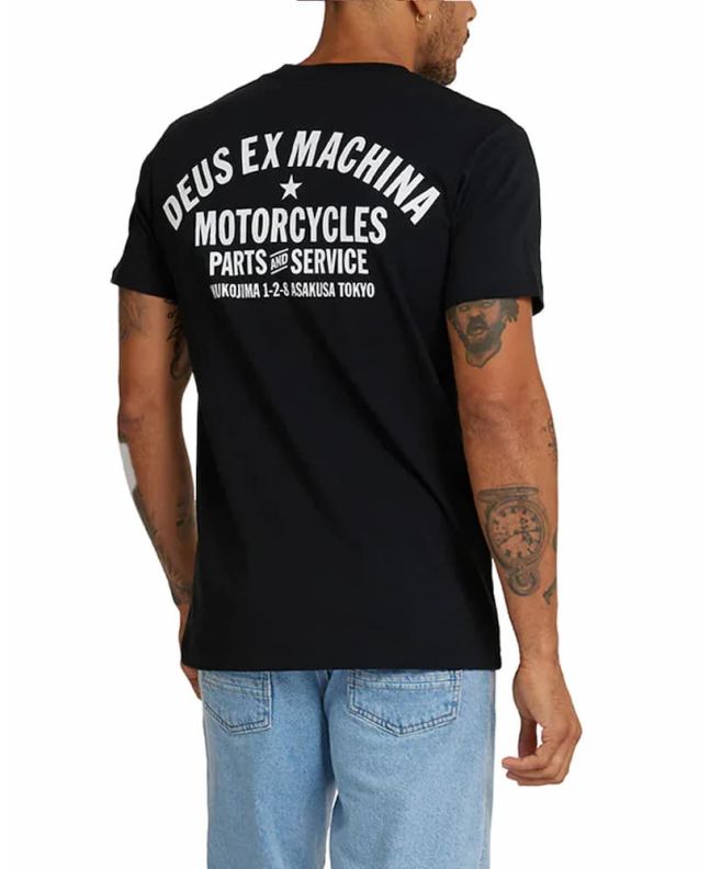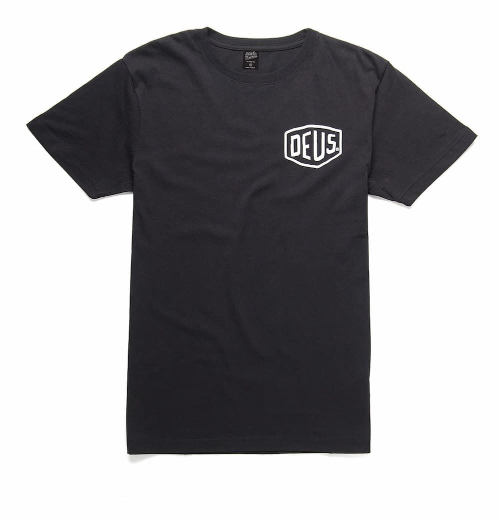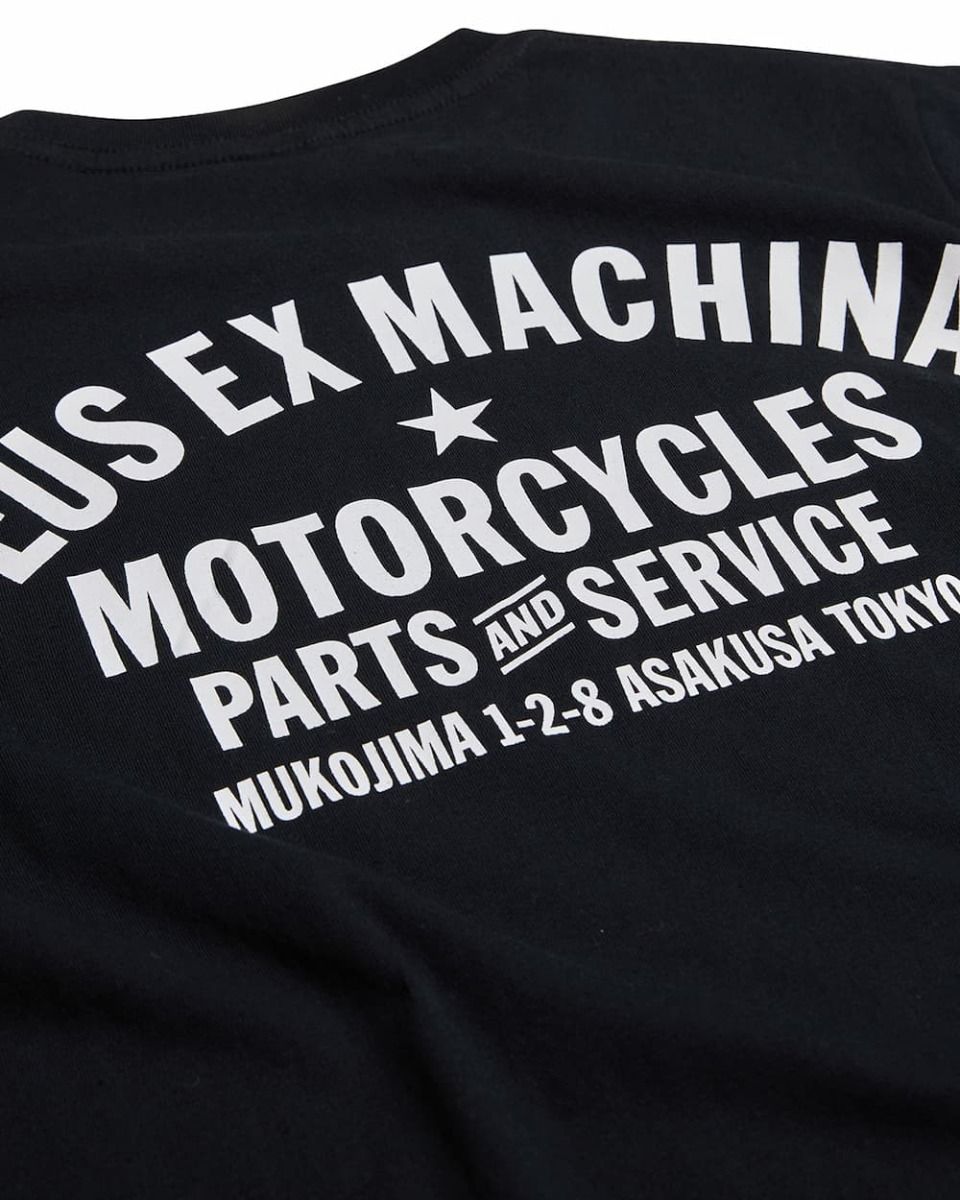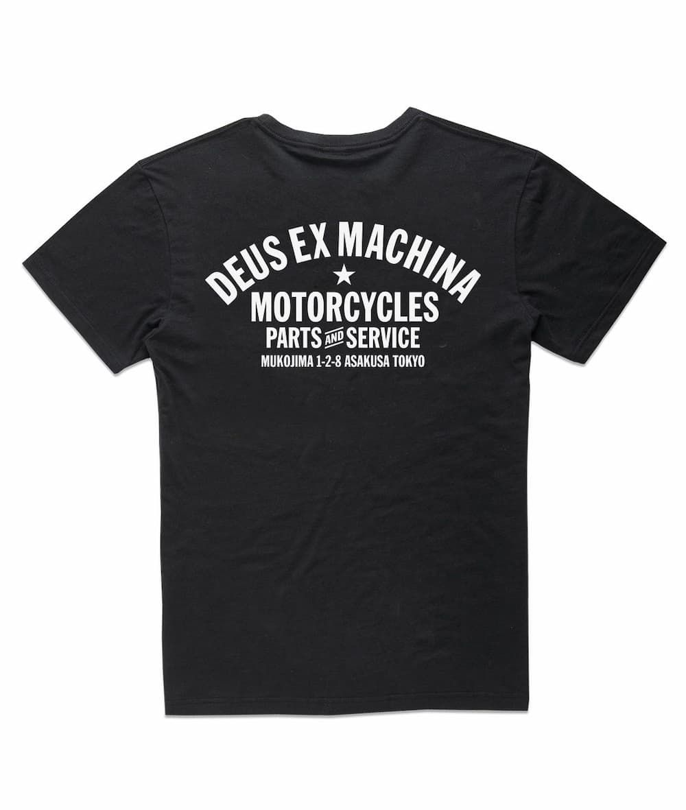 Al frente, el icónico logo escudo DEUS impreso en blanco contrasta sobre el negro puro de fondo. En la espalda, una gráfica envolvente que hace referencia a la tienda Deus de Asakusa, Tokio: "Motorcycles – Parts and Service – Mukojima 1-2-8".