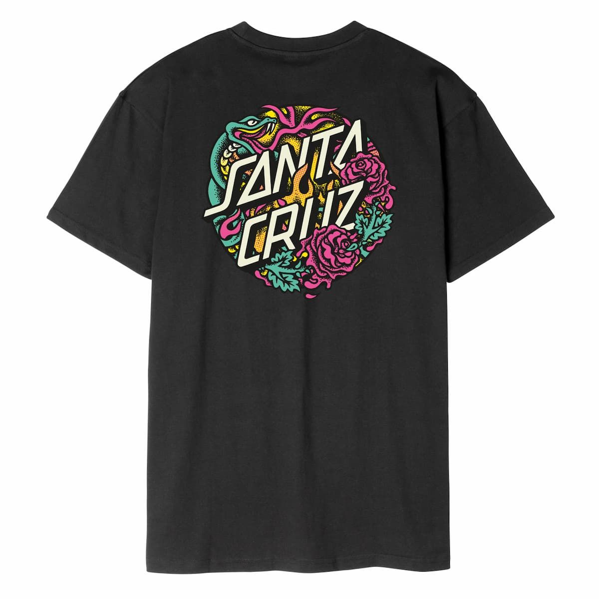 Esta camiseta skater presenta corte clásico, manga corta y cuello redondo para un ajuste cómodo, serigrafiado del logo Santa Cruz con dos rosas en el lado izquierdo del pecho, junto con un gráfico de rosas y una serpiente inspirado en Eric Dressen y Santa Cruz Cruz Skateboards impresos en la espalda.