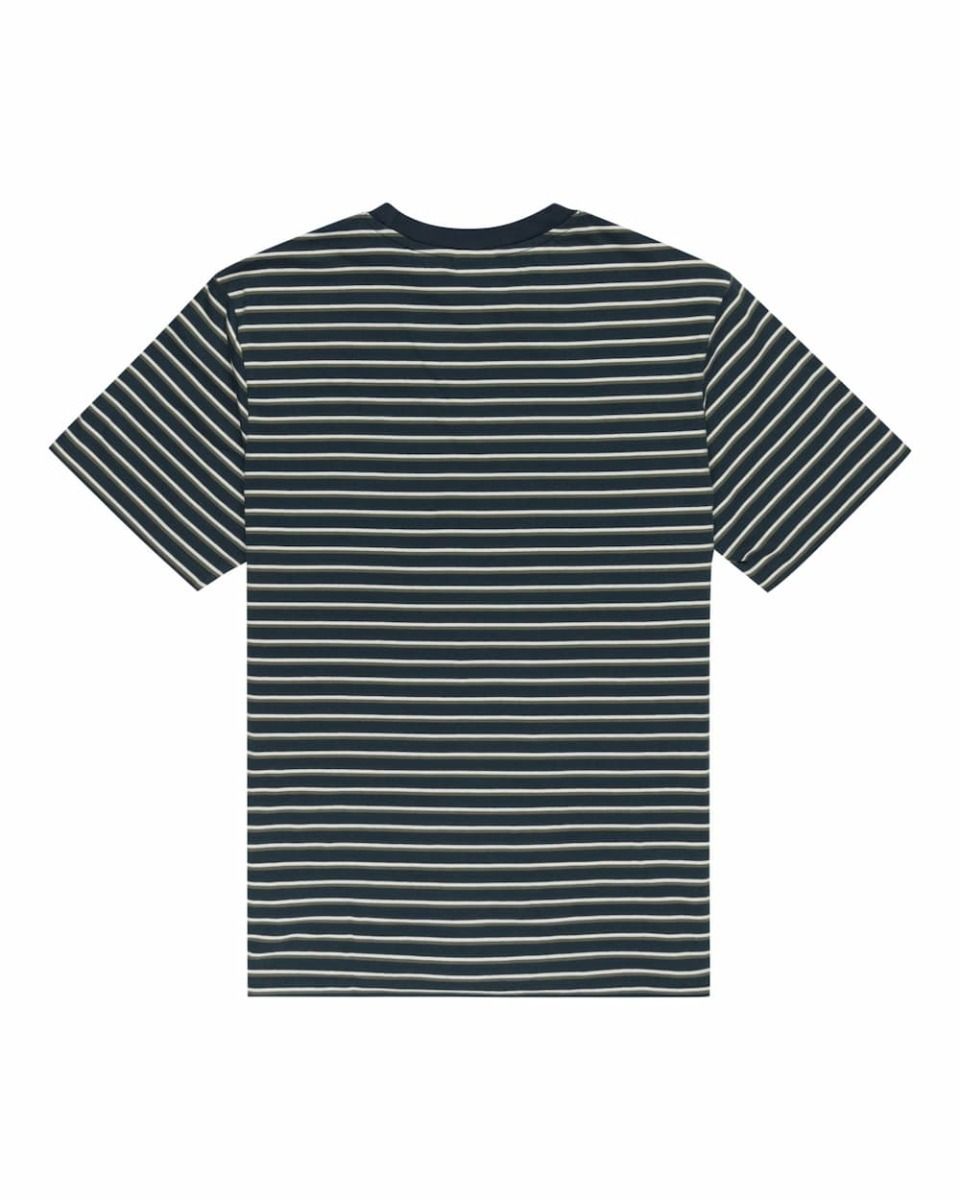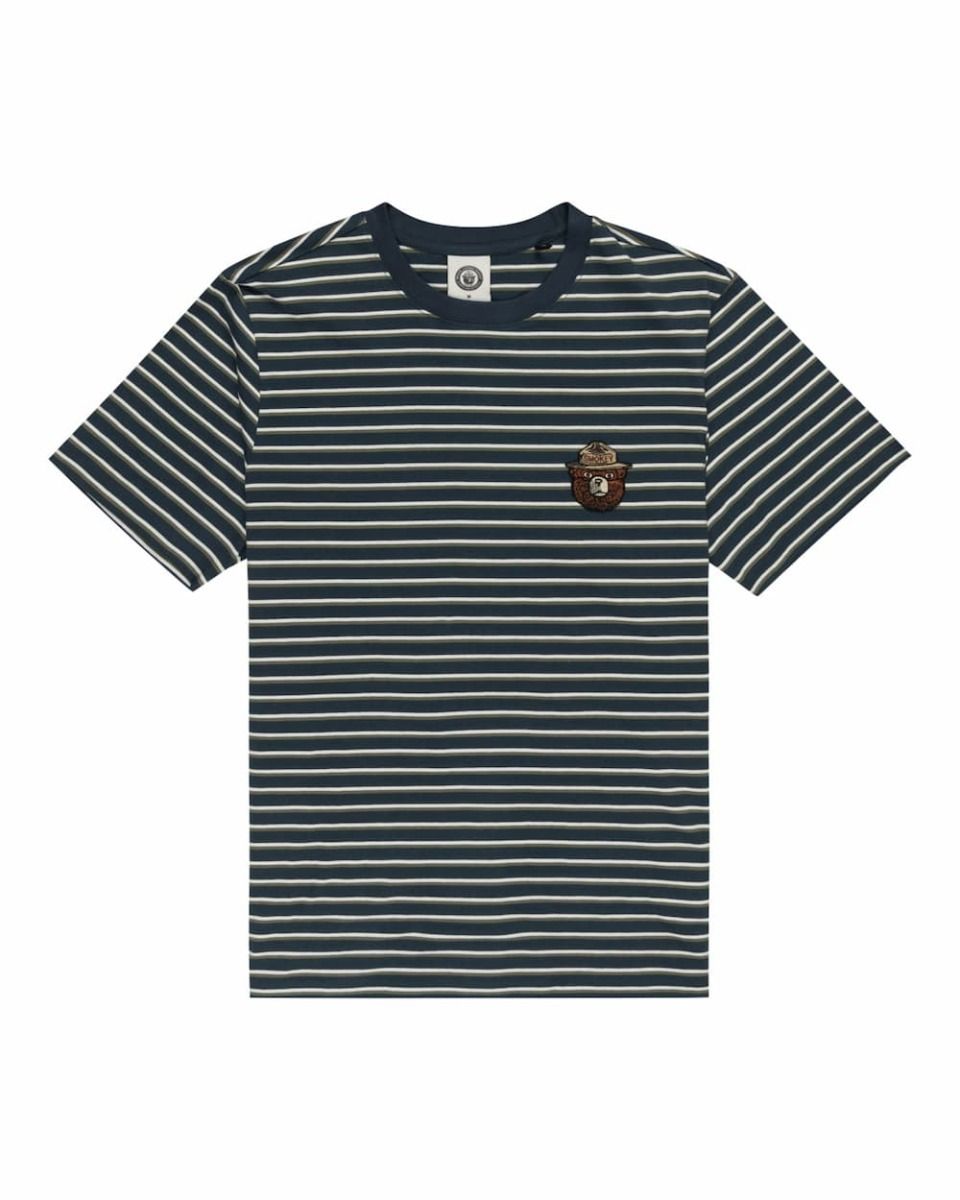 La camiseta Stripes azul marino cuenta con cuello redondo, manga corta, rayas teñidas en hilo, un parche de Smokey Bear tejido en el lado izquierdo del pecho y una etiqueta de Element tejida en la costura lateral.
