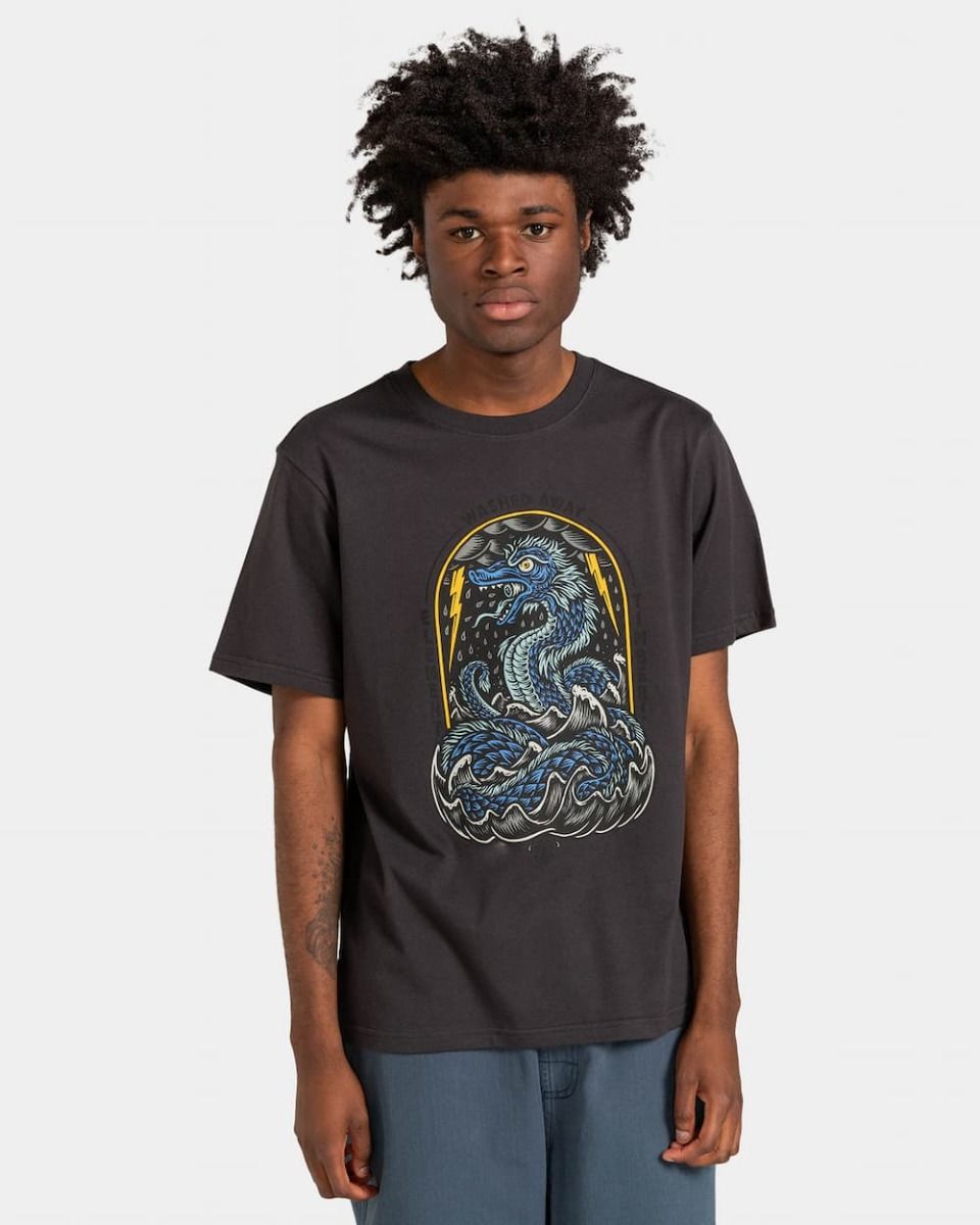 Este camiseta sostenible de corte normal, perteneciente a la Colección Washed Away de Timber! y Element Brand, cuenta con cuello redondo, manga corta y un gráfico exclusivo de una criatura marina del artista Chad Eaton (AKA Timber!) serigrafiado en la parte delantera.