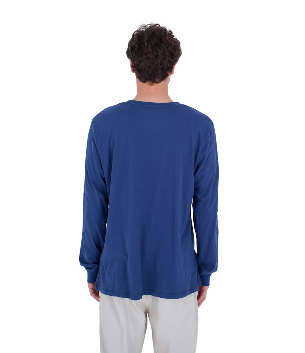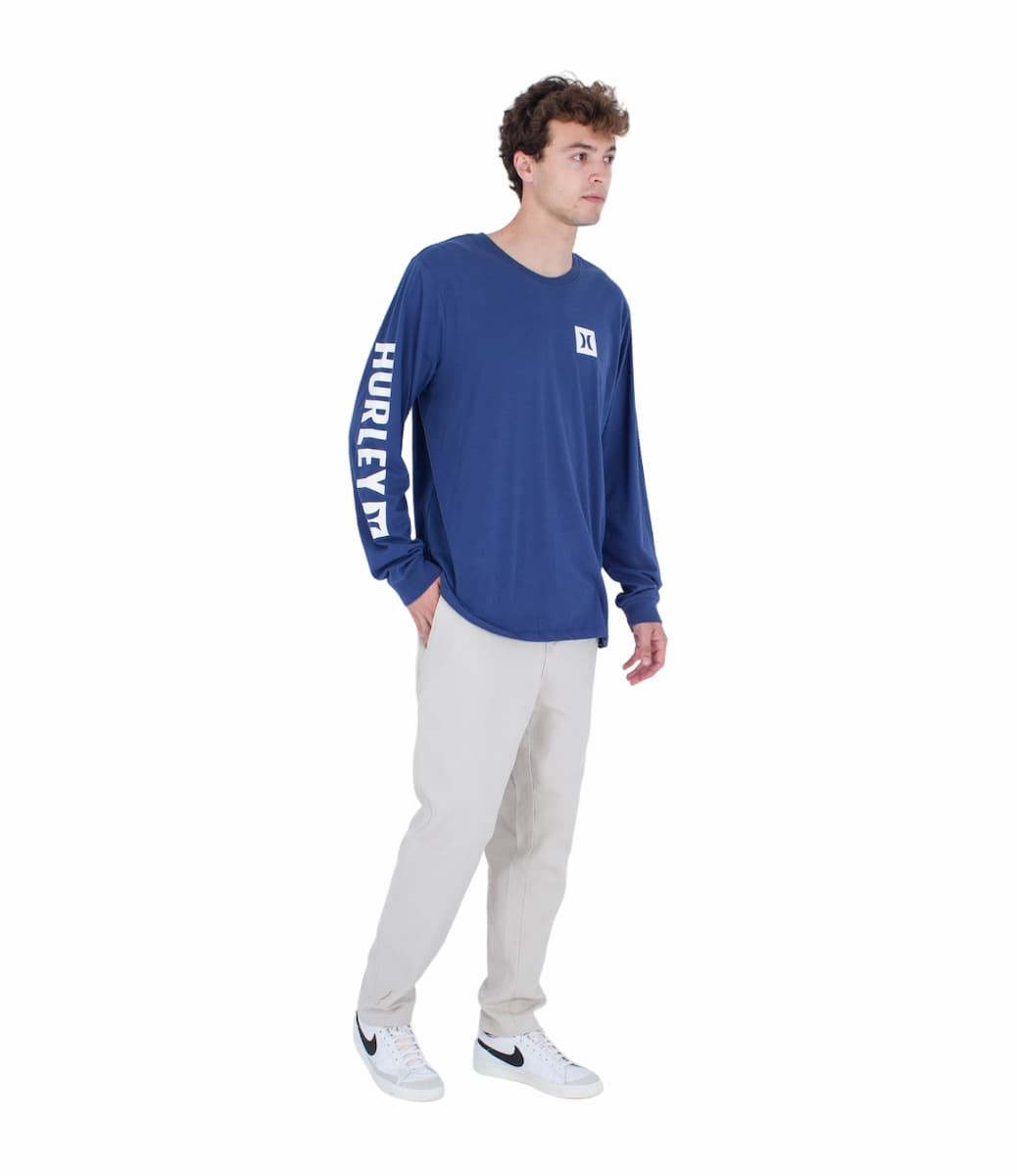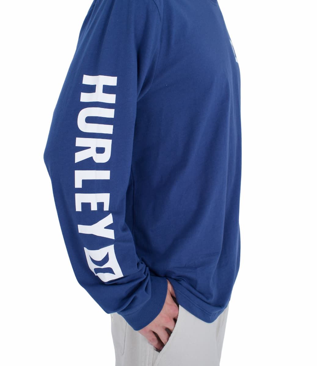 Esta camiseta azul marino de ajuste estándar viene con cuello redondo, manga larga, construcción con costuras laterales, junto con serigrafiados suaves Hurley en color blanco impresos en el lado izquierdo y en la manga derecha para un look deportivo casual.