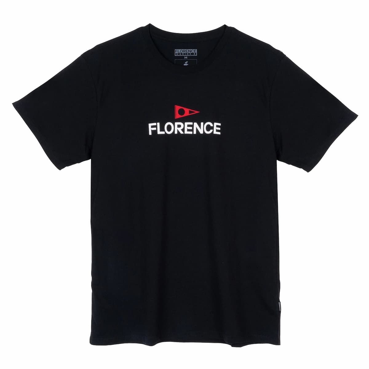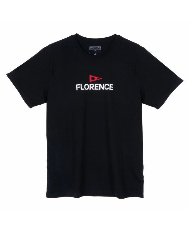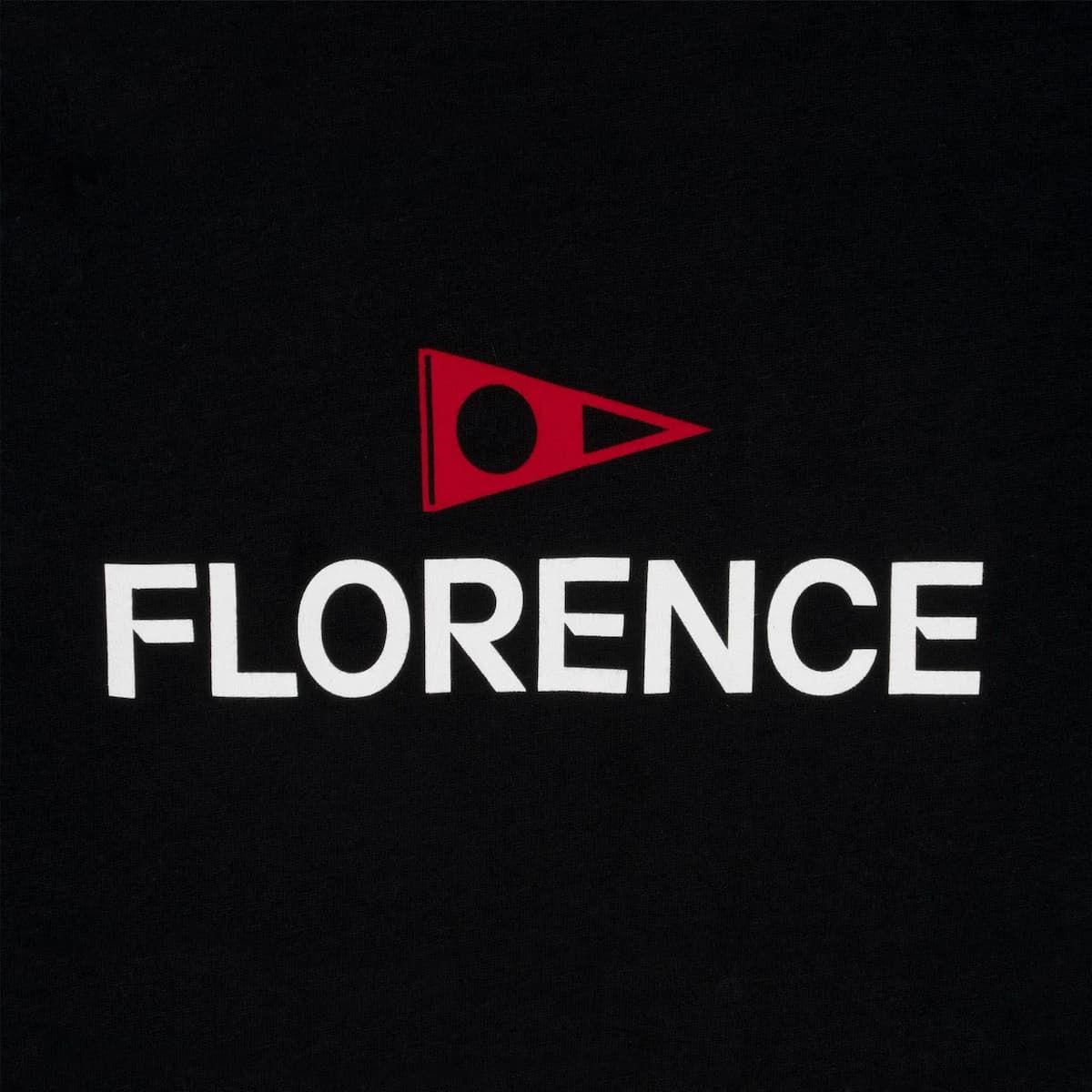 Esta camiseta negra de corte normal cuenta con cuello redondo, manga corta y el logo de Florence impreso en la parte delantera.
