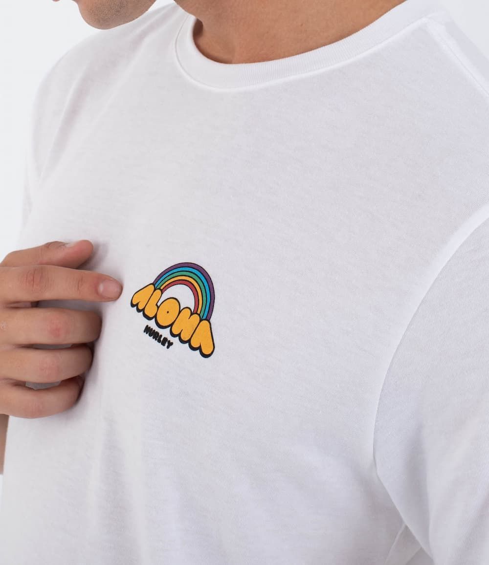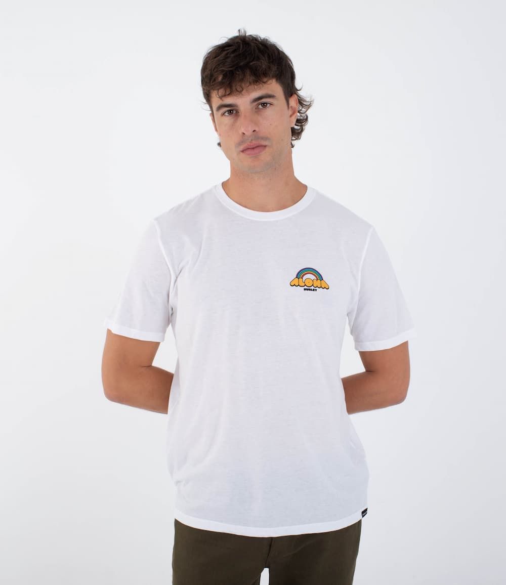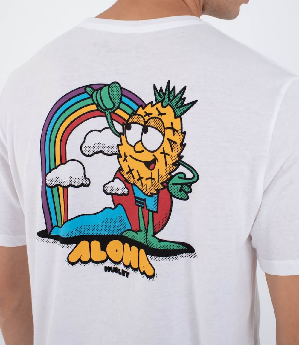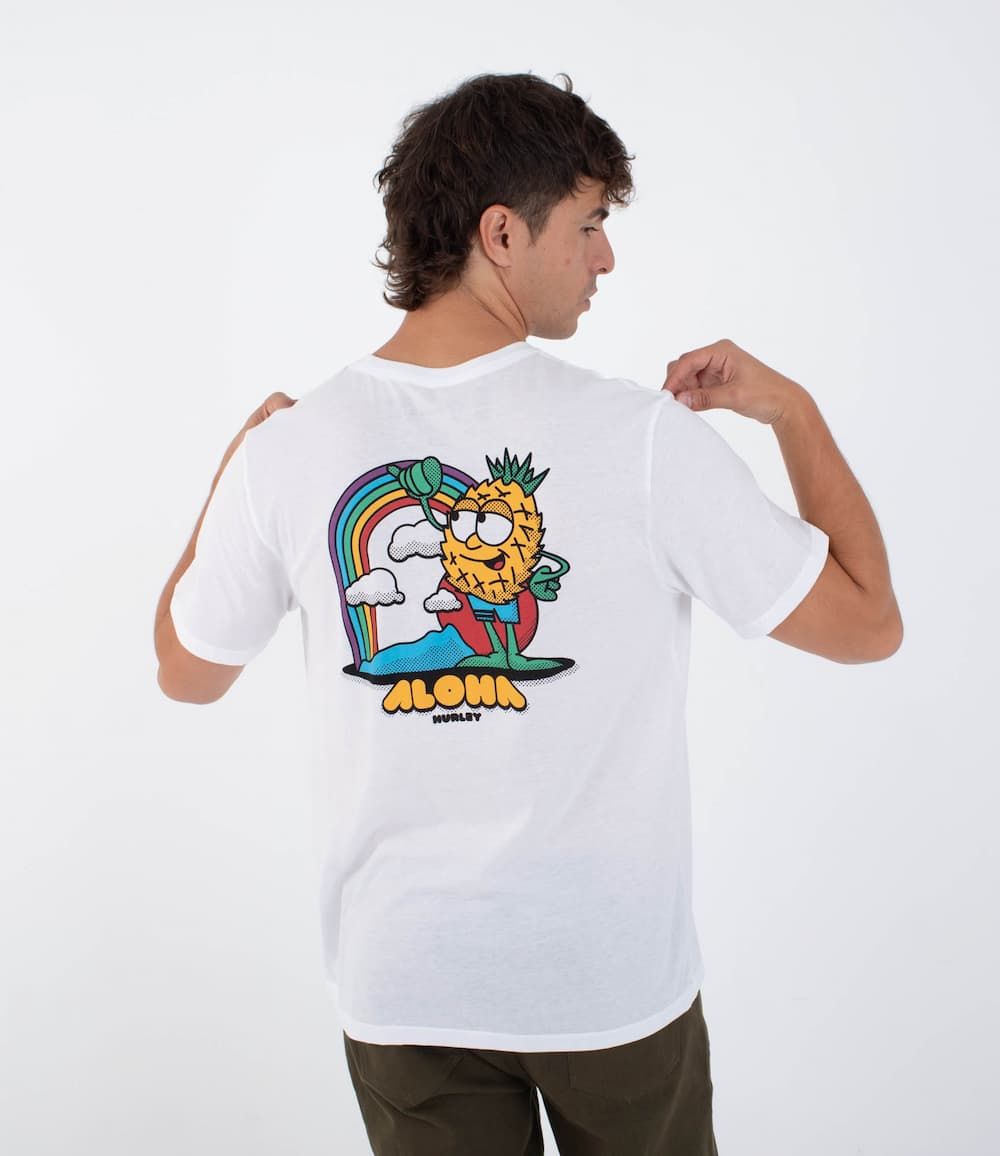 El pequeño logo “ALOHA” con arcoíris en el pecho es solo el adelanto. En la espalda, una serigrafía a todo color con un simpático personaje con forma de piña bajo el arcoíris añade un toque divertido y muy Hurley. Un diseño que rinde homenaje al estilo gráfico ochentero y al surf más auténtico.