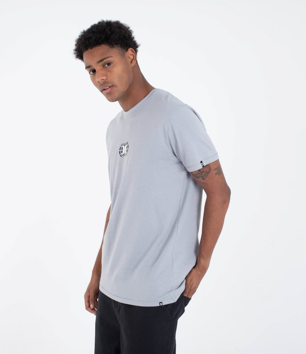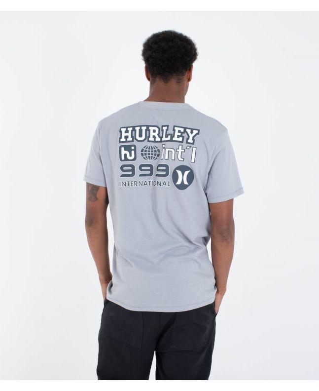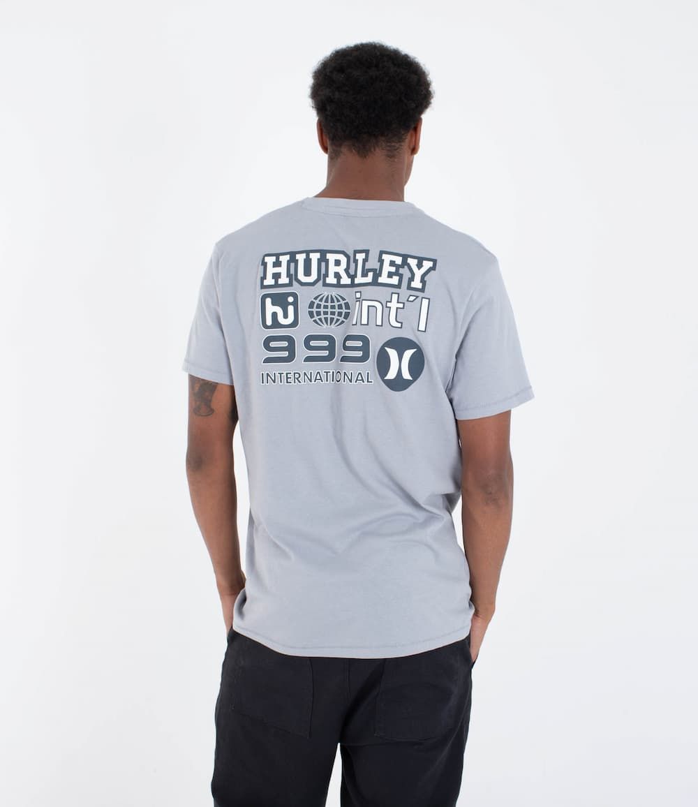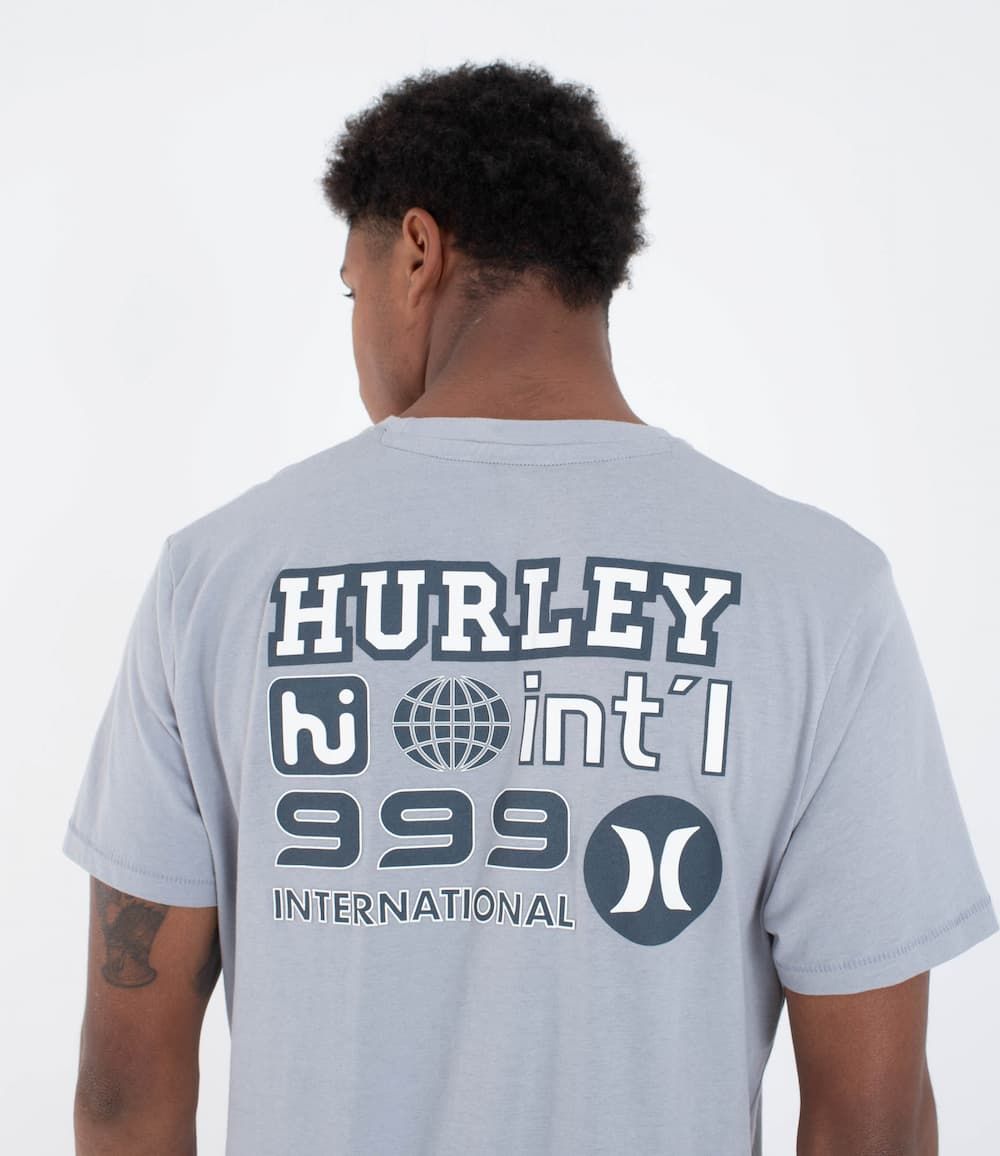 El diseño incluye un logo tipo globo terráqueo con el icónico símbolo de Hurley estampado en el pecho y una composición gráfica en la espalda con múltiples referencias visuales a la identidad “international” de Hurley. Estos elementos visuales aportan una estética retro con carácter, inspirada en la escena underground del skate y el grunge de principios de los 2000.
